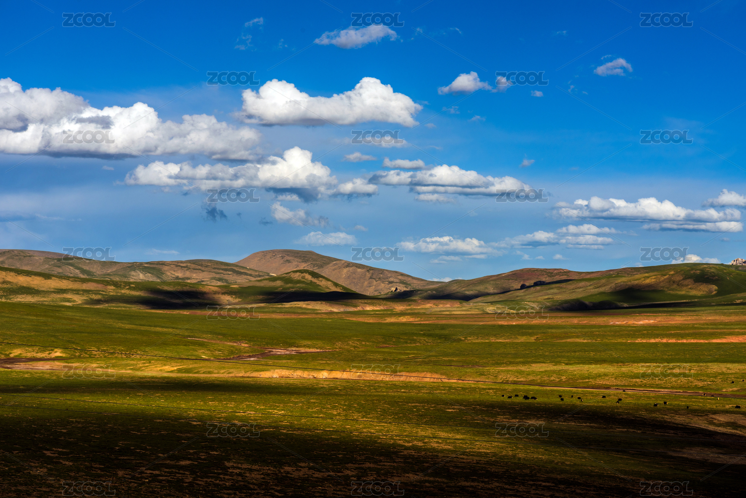 蓝天白云下的草原山脉和高原牧场,中国西藏