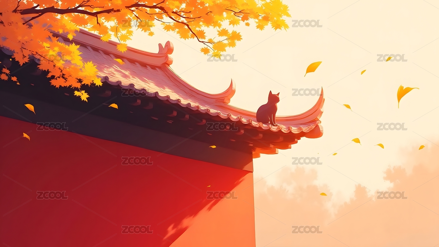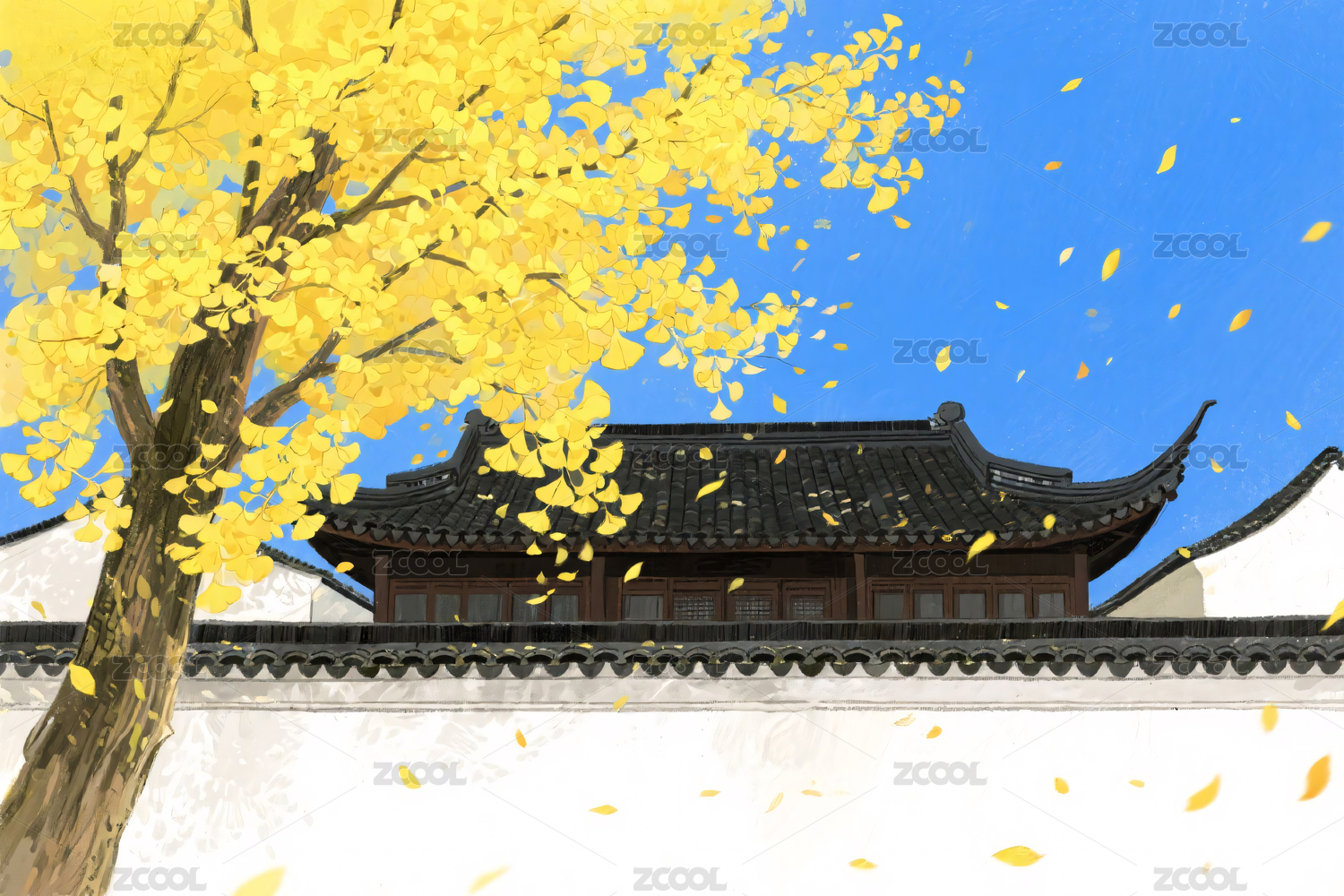 秋天中式建筑屋顶银杏树叶插画背景壁纸
