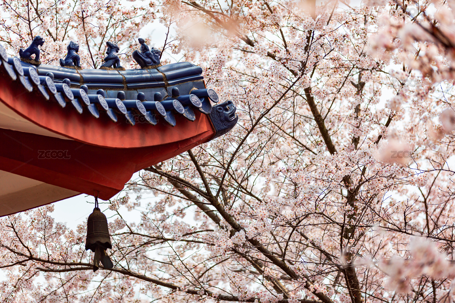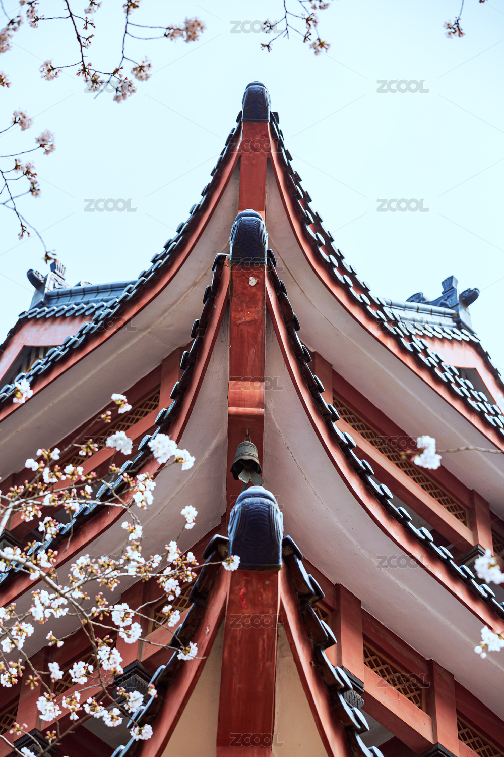 武汉堤角公园中式亭院边盛开的樱花