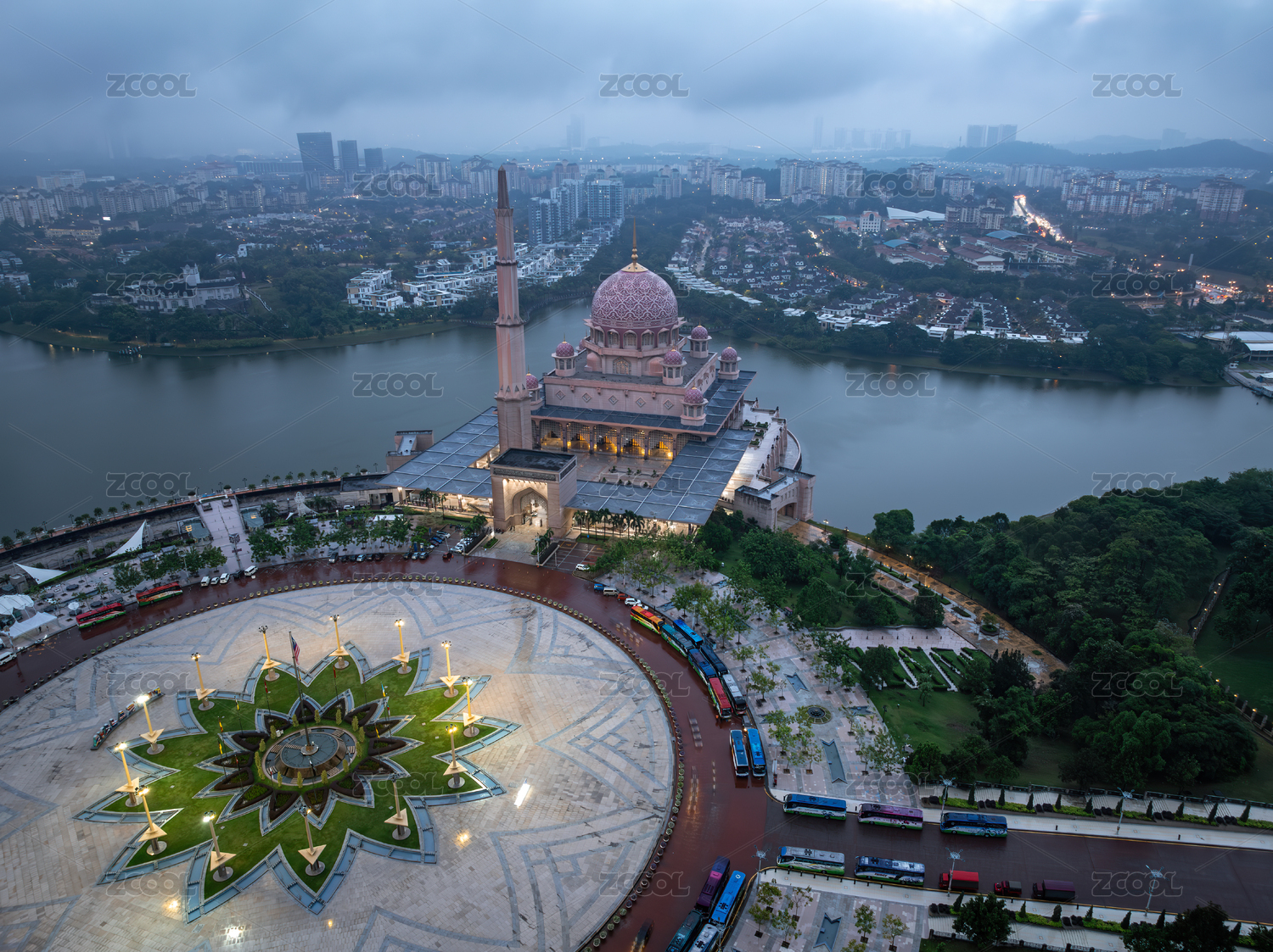 马来西亚布城粉色水上清真寺建筑景观航拍