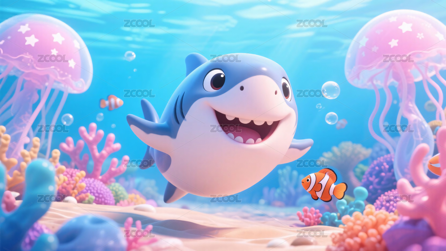 低面多边形海中的鲨鱼玩具模型3D立体插画