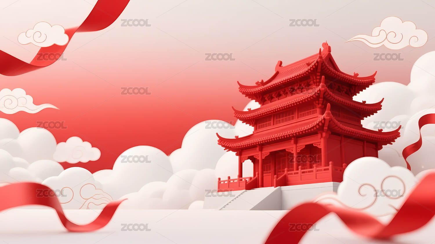 红色建筑丝带节日背景