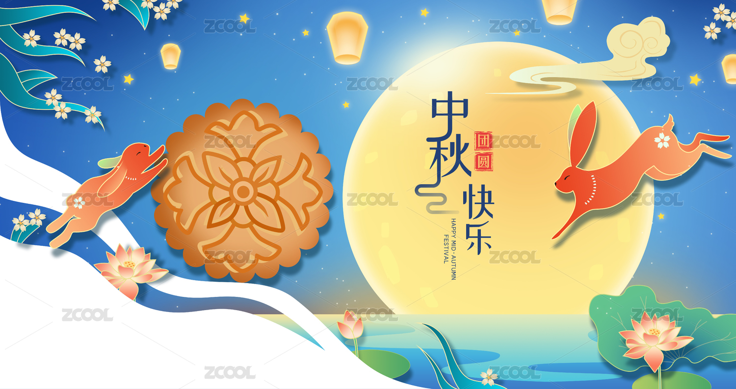 中秋佳节剪纸风满月夜玉兔与月饼插画