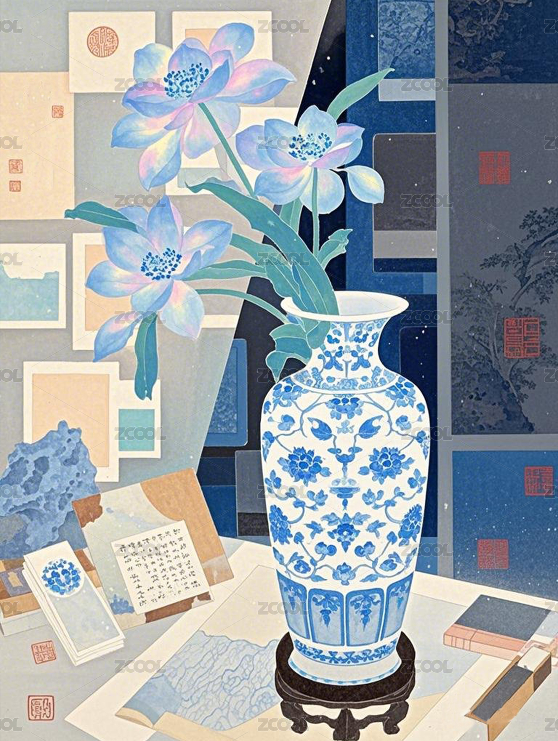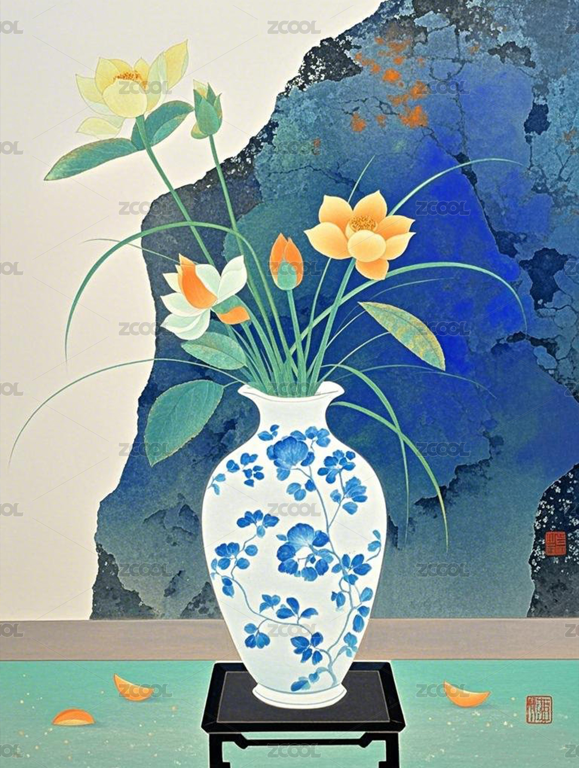 24节气之案几上的插花与太湖石