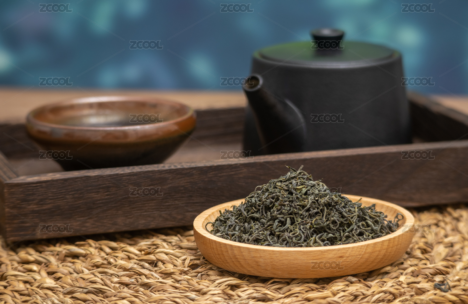 桌面上的盘子里的干爽清香的高山绿茶