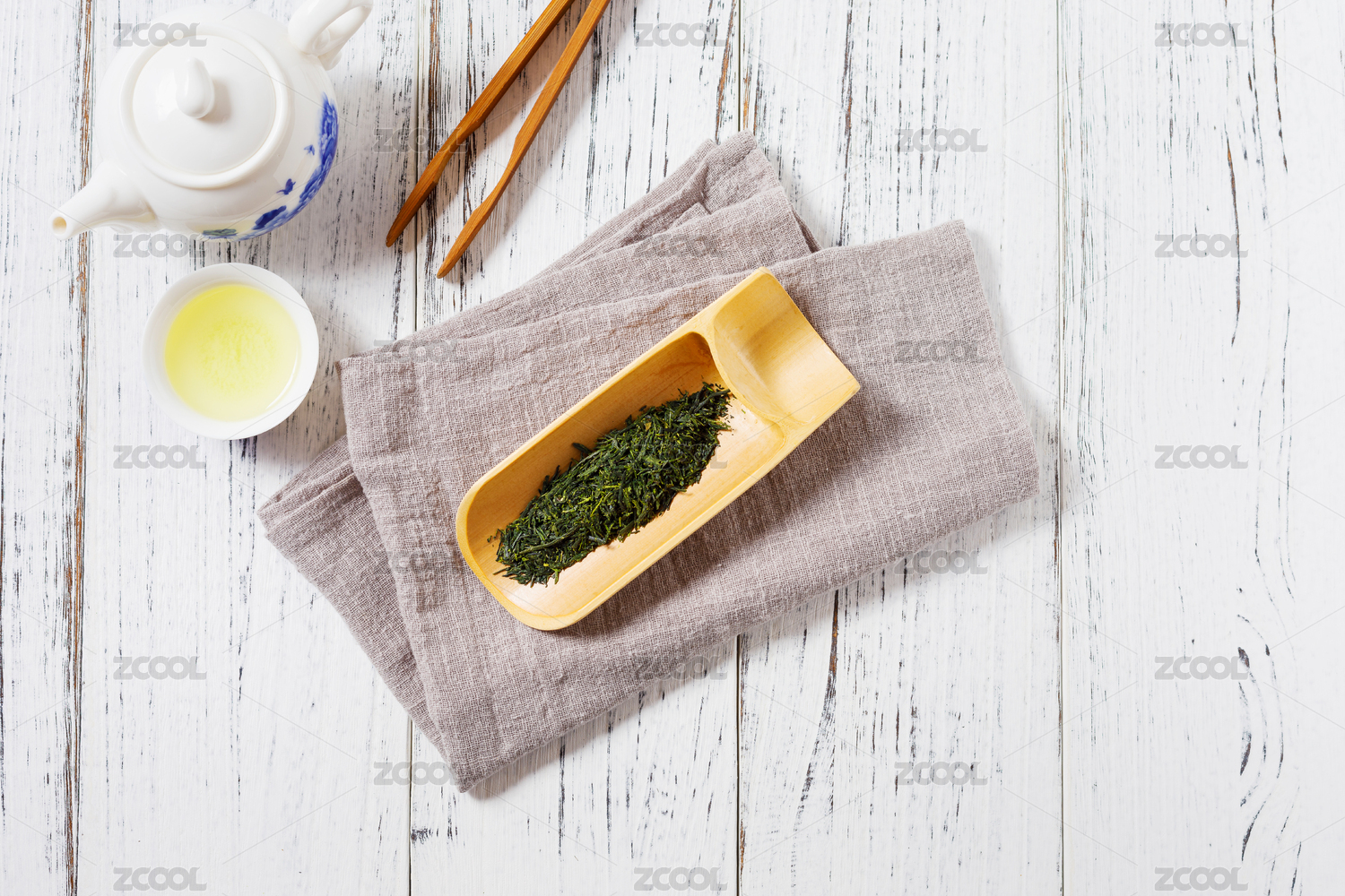 放在木桌上的一杯日本京都宇治玉露茶和茶叶