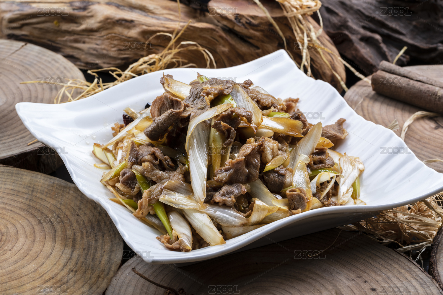 方形花瓷盘装的大葱爆羊肉摆放在樟木砧板上
