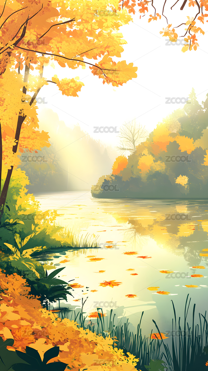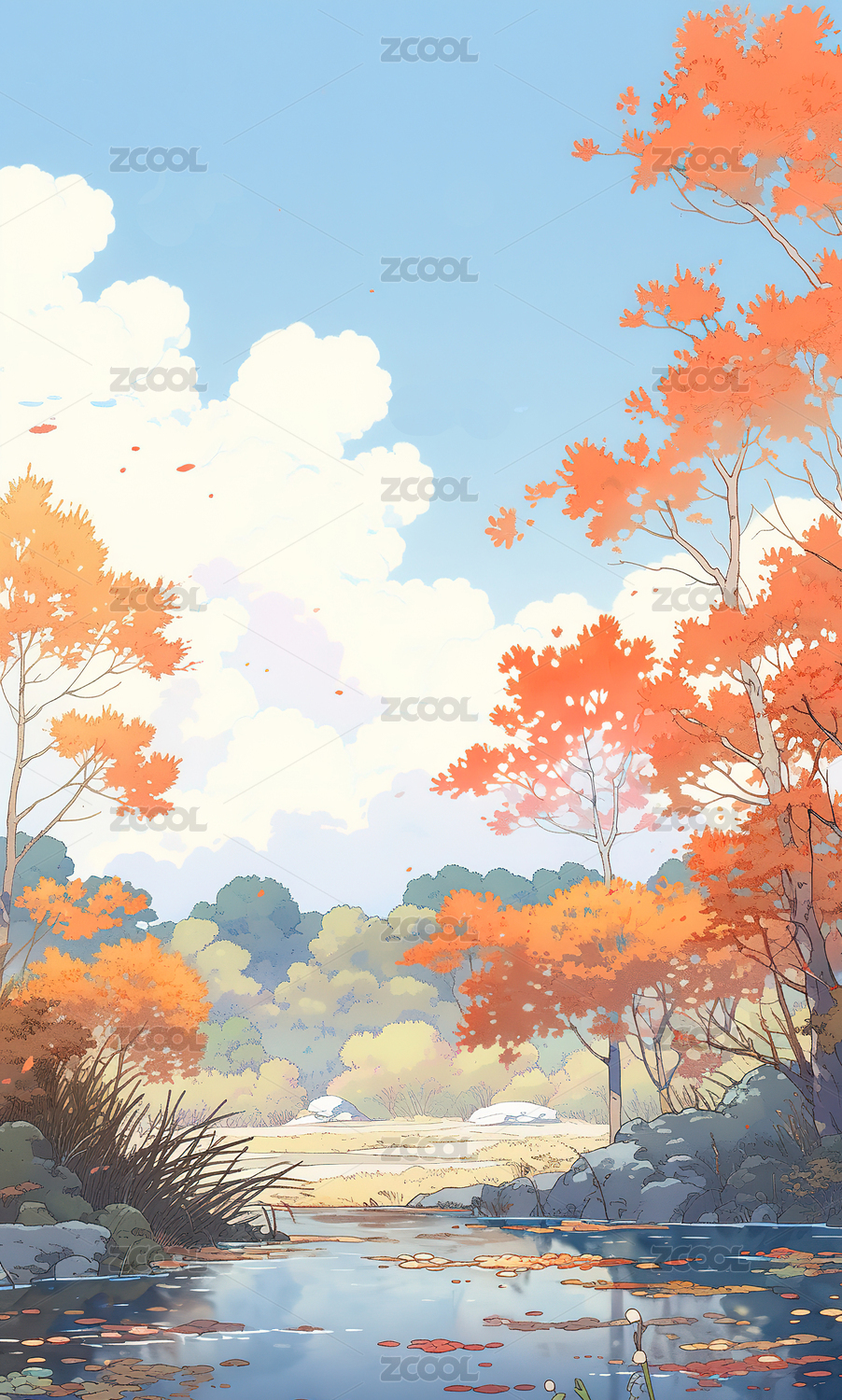 手绘卡通蓝色天空下的森林湖泊风景插画