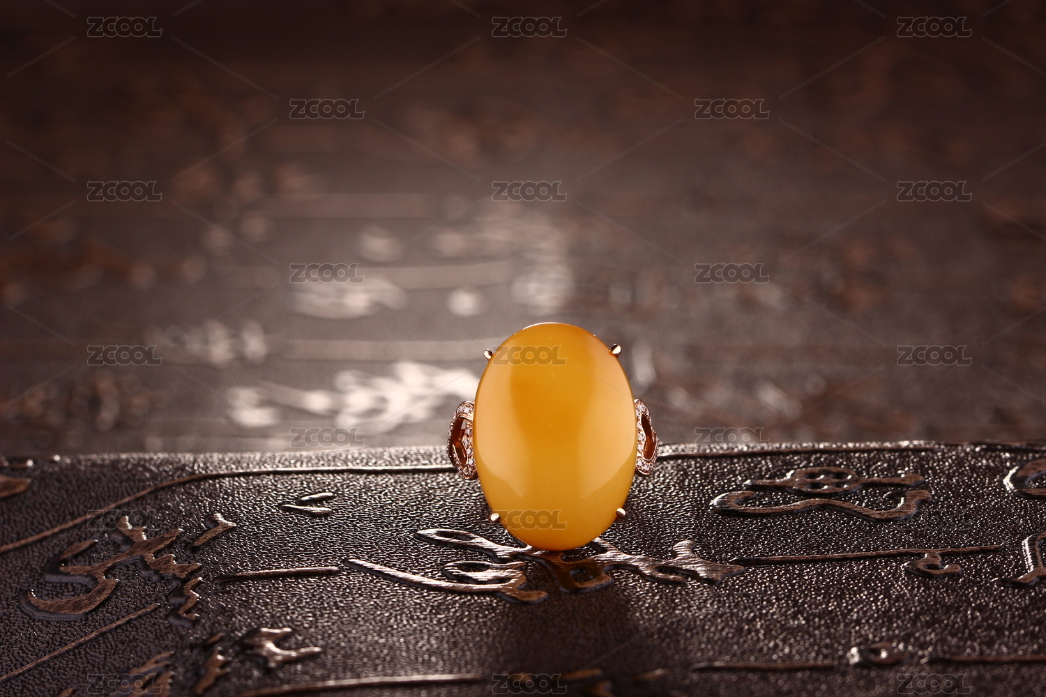 琥珀蜜蜡戒指放在深色的场景中