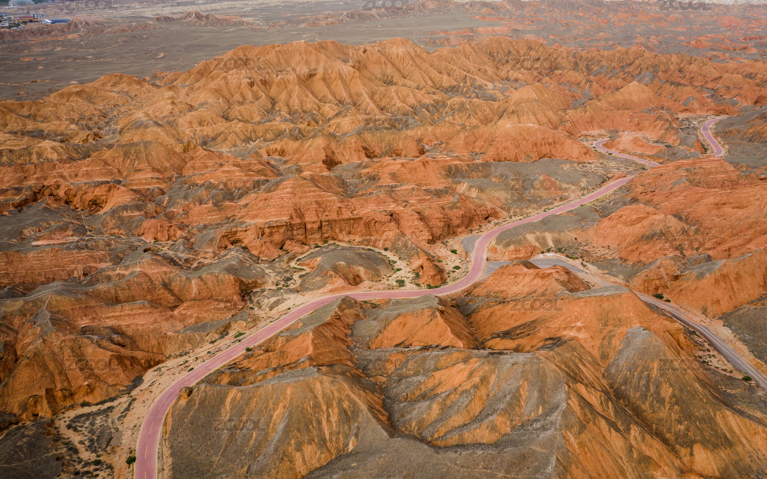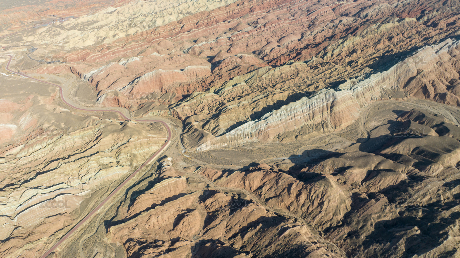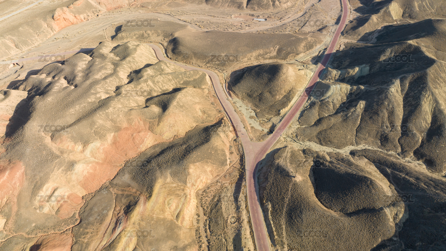 航拍中国新疆戈壁滩上的丹霞地貌与高速公路