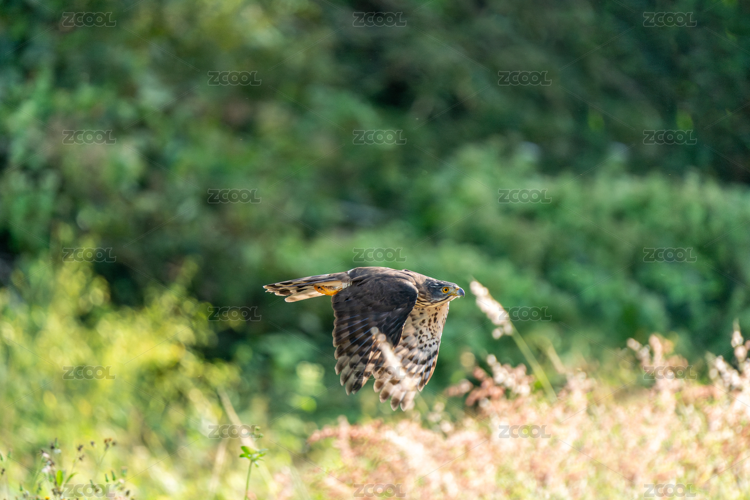 凤头鹰穿梭在林间空地中低空飞翔寻找食物
