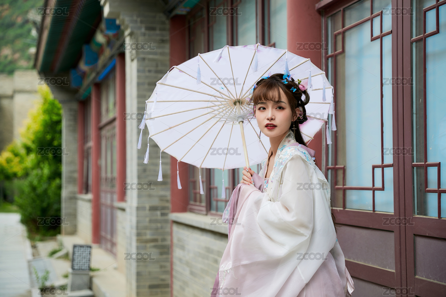 穿古装汉服手持工艺伞的东方美少女