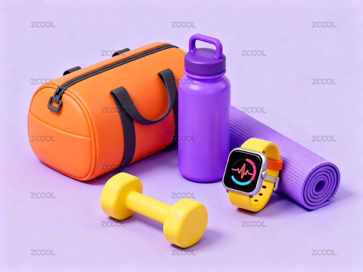 卡通运动手环和哑铃瑜伽垫模型3D渲染