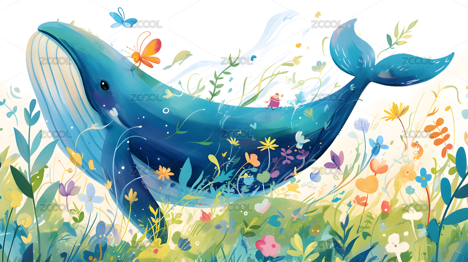 夏天梦境可爱女孩在热气球梦幻云中遇鲸插画