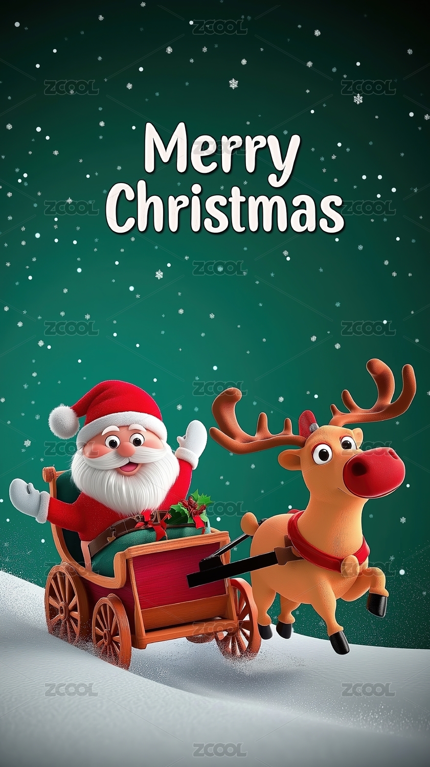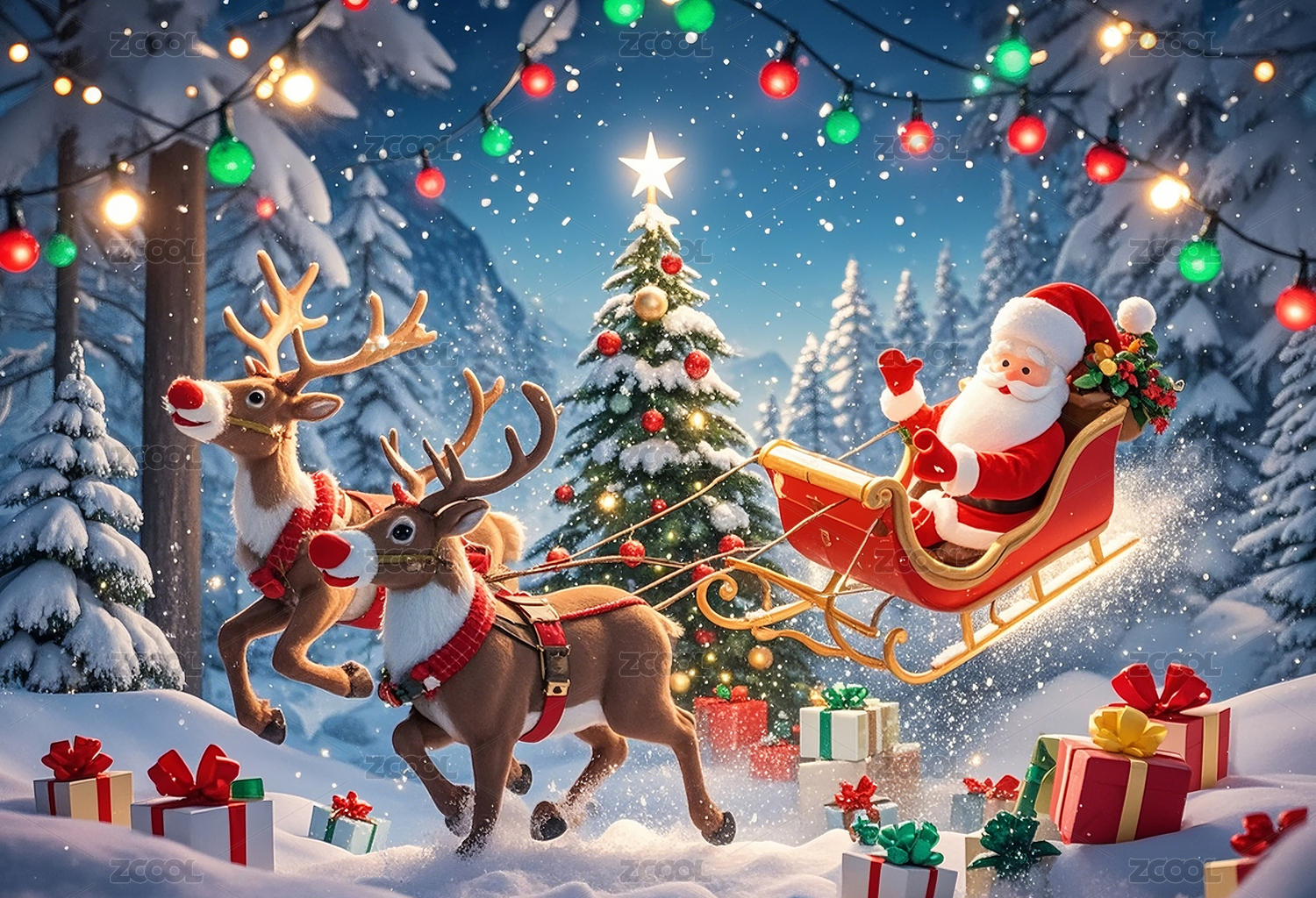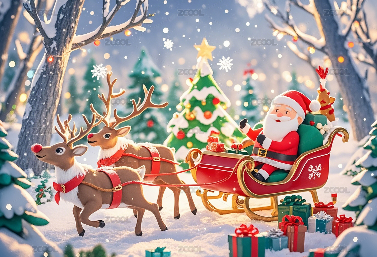 麋鹿驮着滑雪车上的圣诞老人在雪路上驰骋