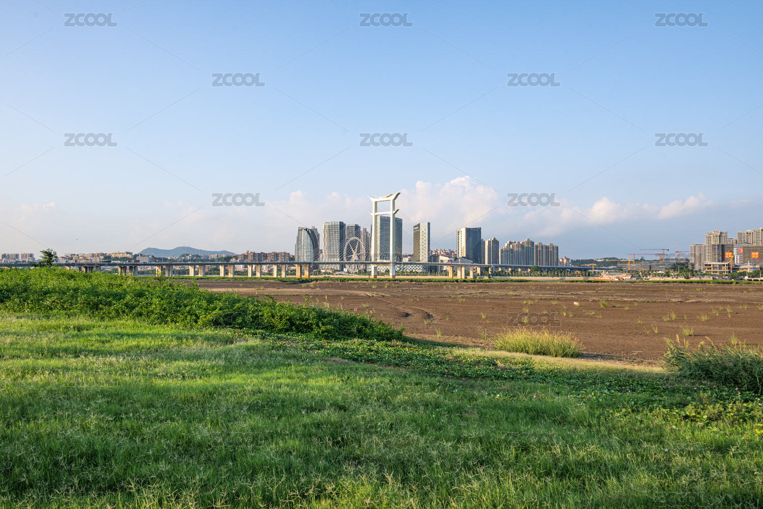 中国福州城市生态公园与马尾自贸区现代化高楼景观