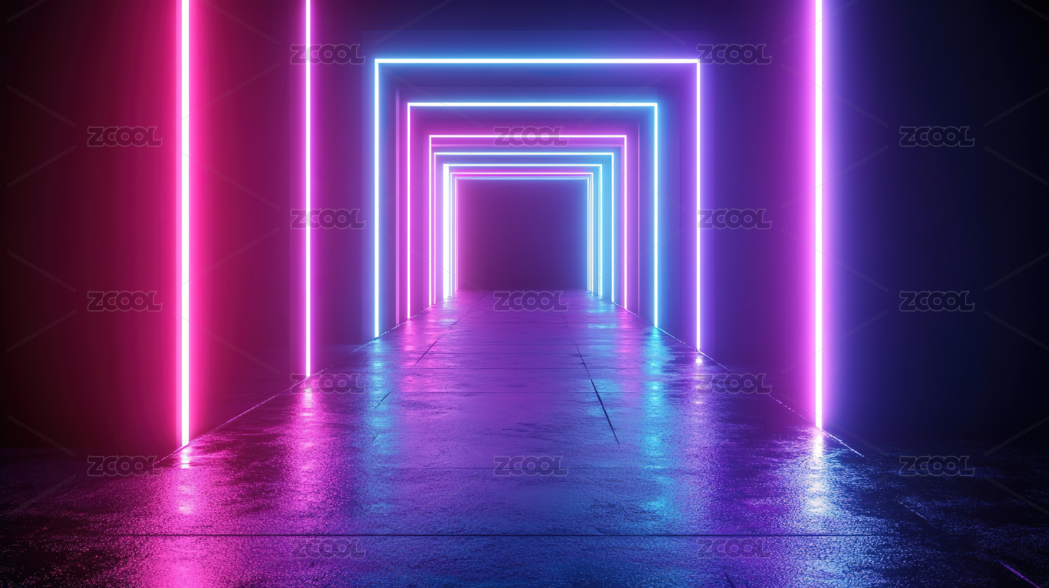 三维渲染蓝紫色霓虹灯拱门室内空间