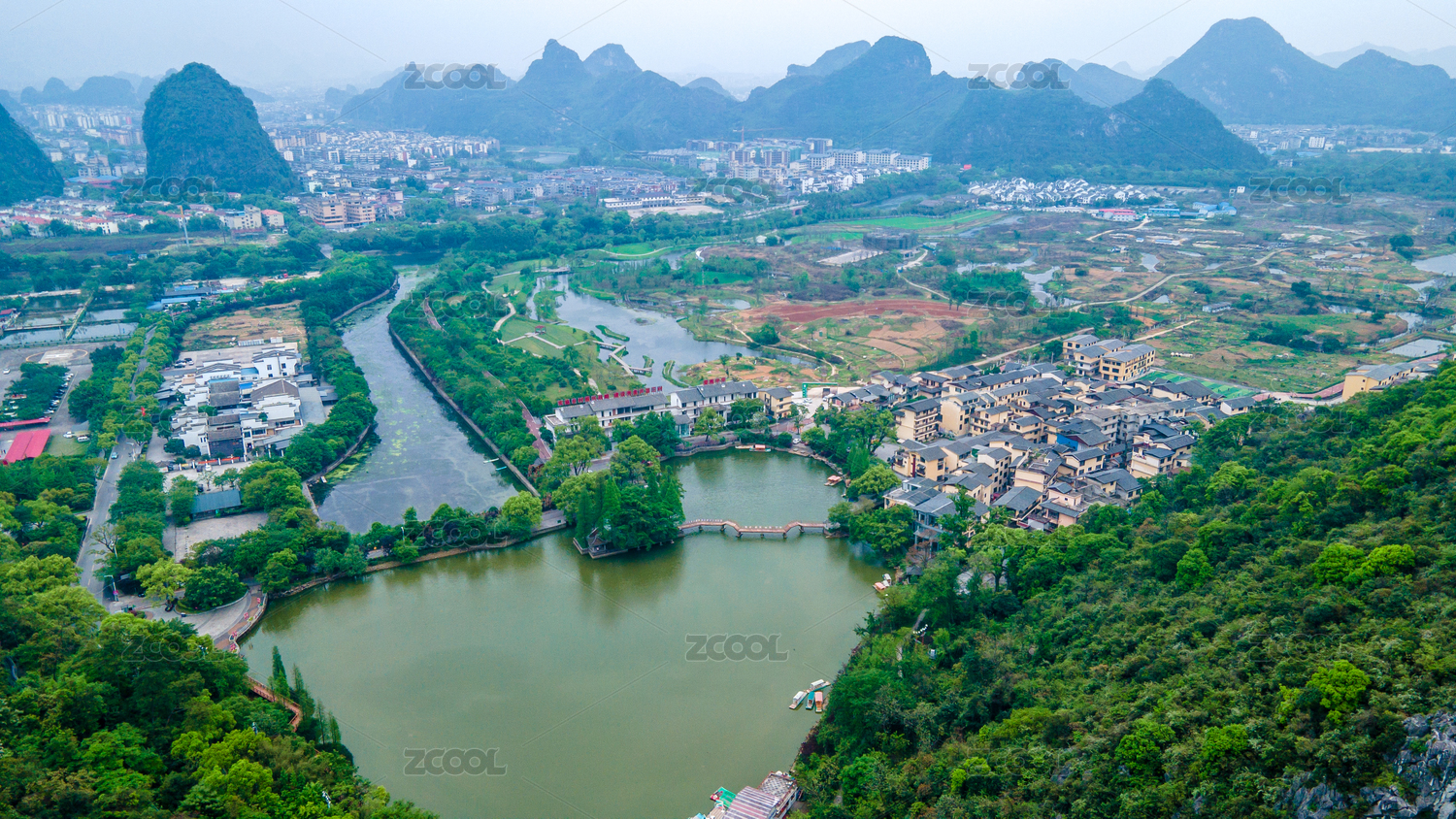 航拍桂林桃花湖景公园及建筑