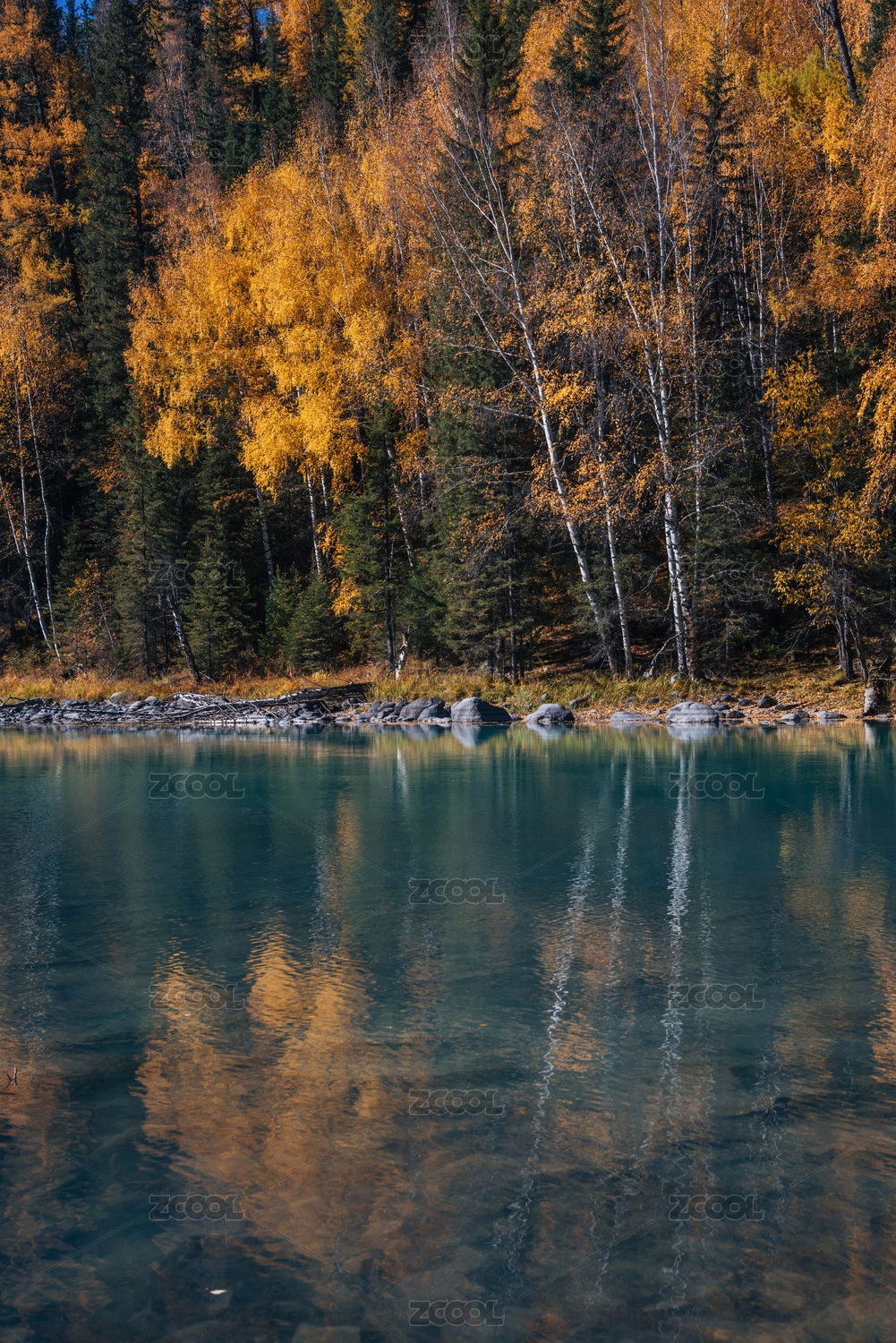 中国新疆喀纳斯清澈湖水白桦林秋色风光