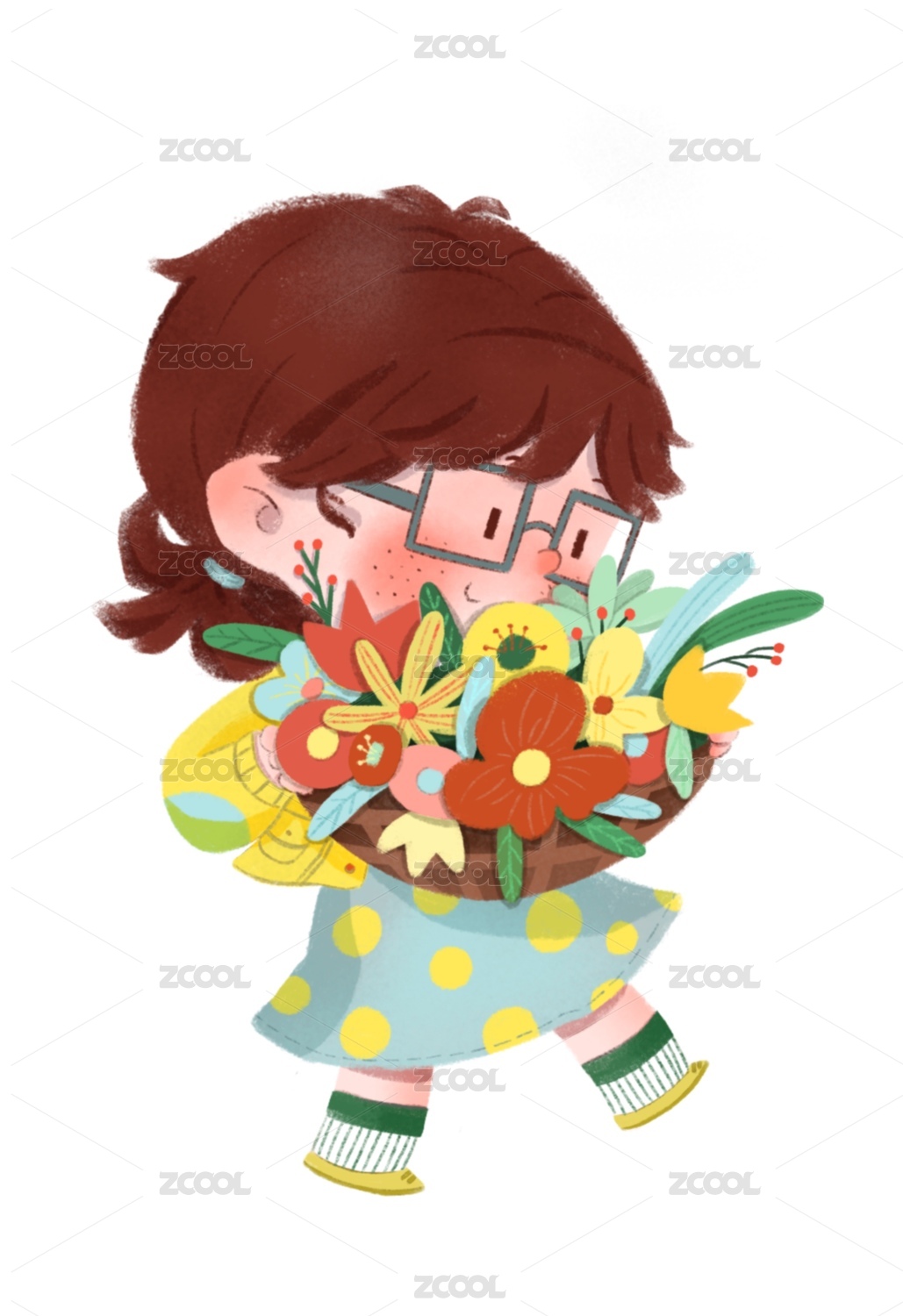 拿着花的女孩可爱卡通插画
