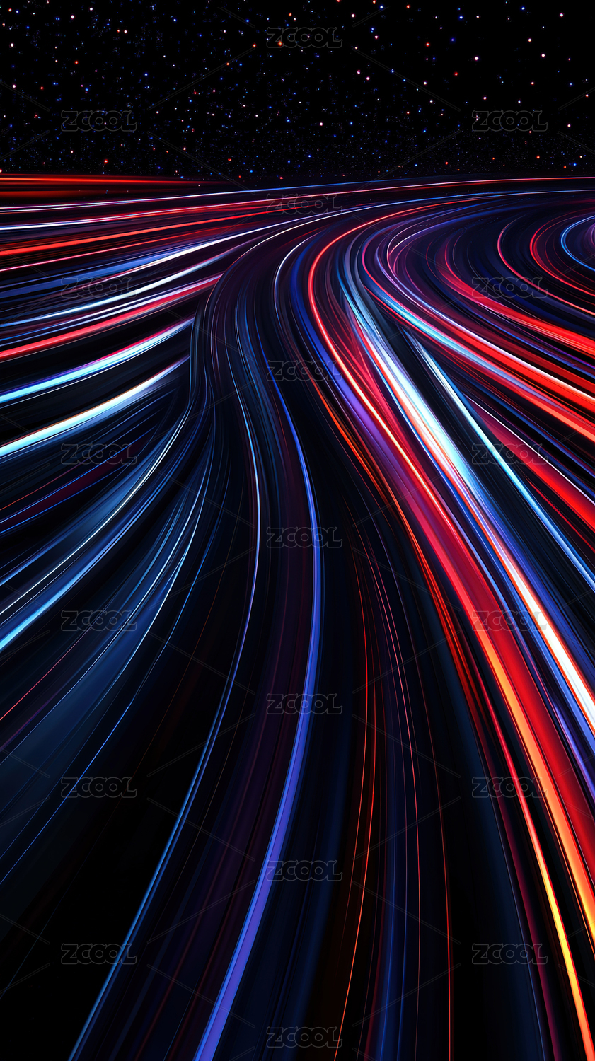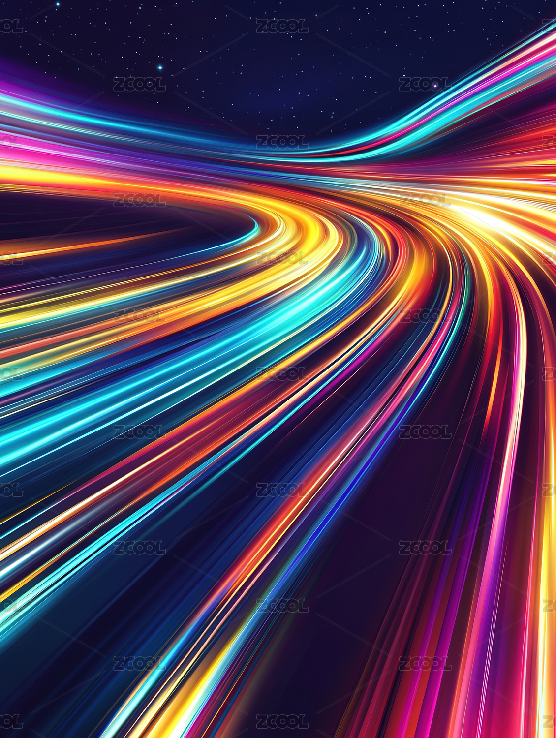 流光溢彩的公路发光彩色速度线黑色背景插画