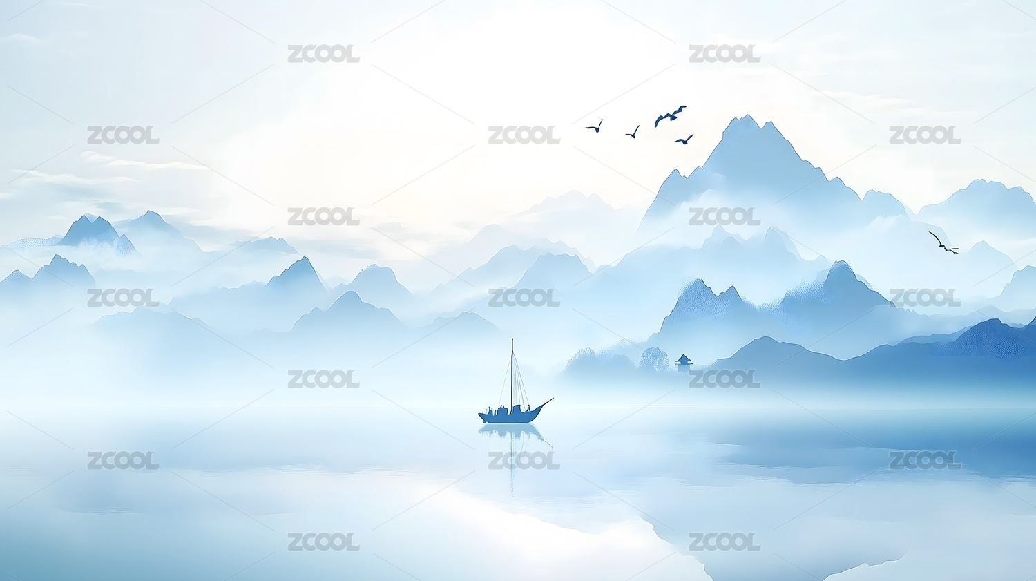 轻柔雾霭下的水墨山水与孤舟
