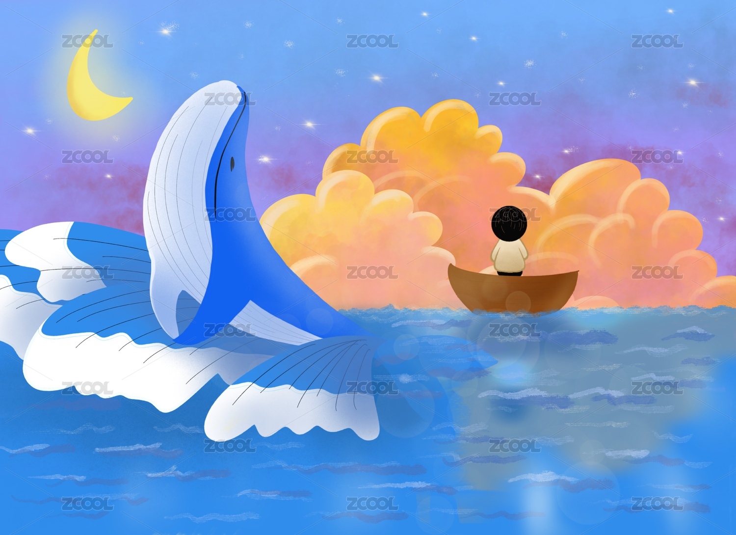 夜晚星空猫和鲸鱼文艺小清新治愈手绘插画