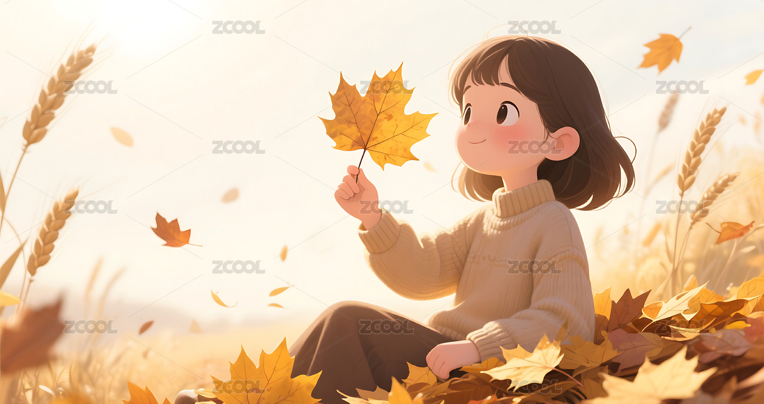 秋日芦苇丛中,女孩和狗在田野里玩,唯美卡通治愈的秋景插画