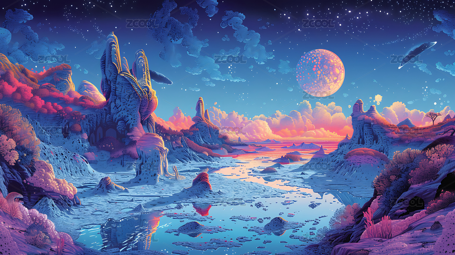 自然,插画,天空,现代,多色的,壁纸,风景,夜晚