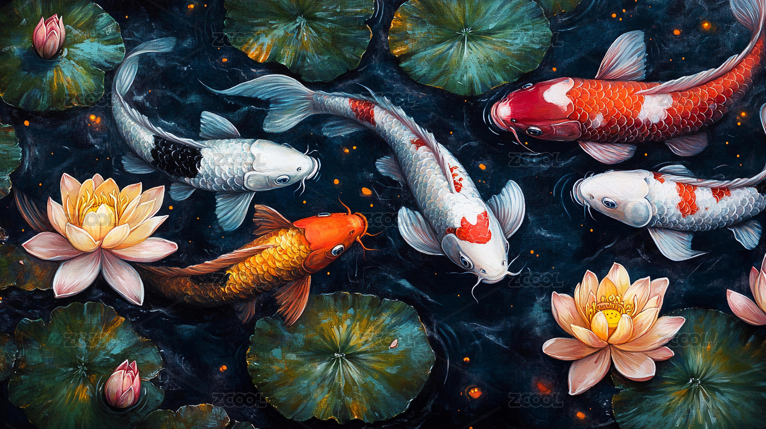 荷塘荷花荷叶锦鲤植物鱼动物中国风