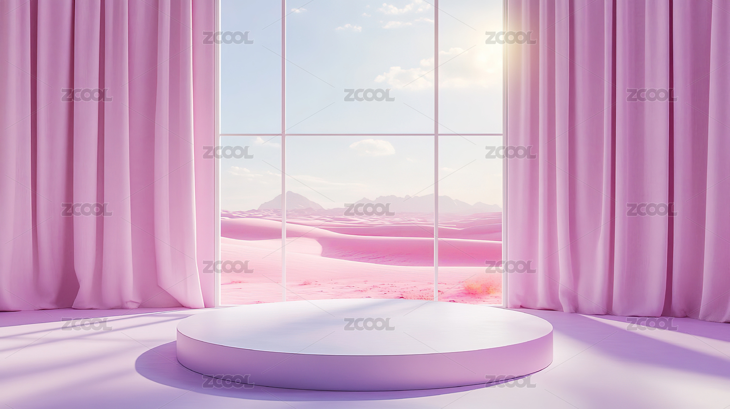 白色圆形平台与粉蓝窗帘