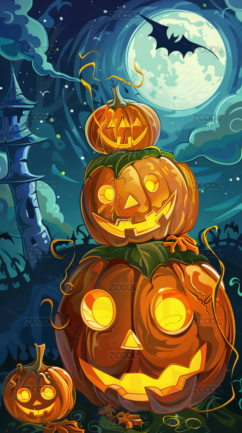 万圣节,南瓜,夜晚,深色,女巫,蝙蝠,鬼怪,诸圣节,手绘插画