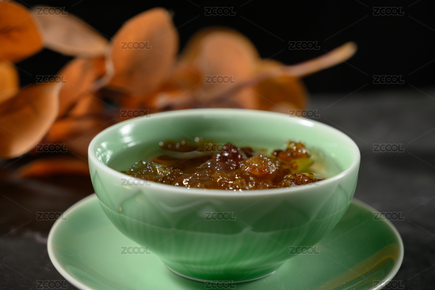桌面上的盘子里的美味可口的冰糖炖桃胶