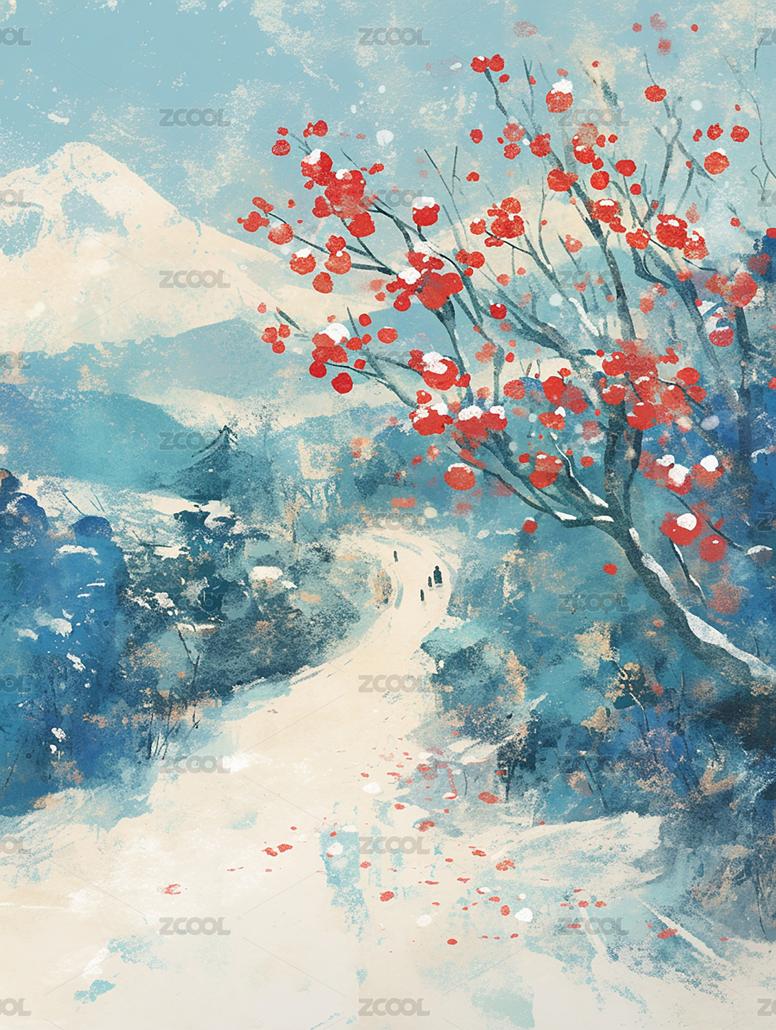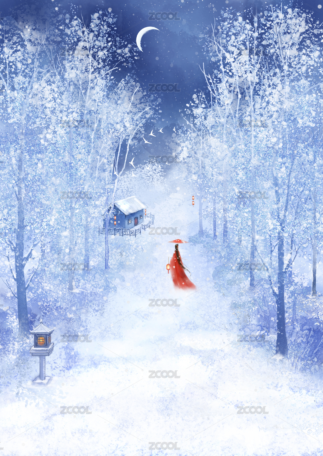 插画,雪,冬天,唯美,蓝色,宁静,寒冷,小木屋,夜晚,节气