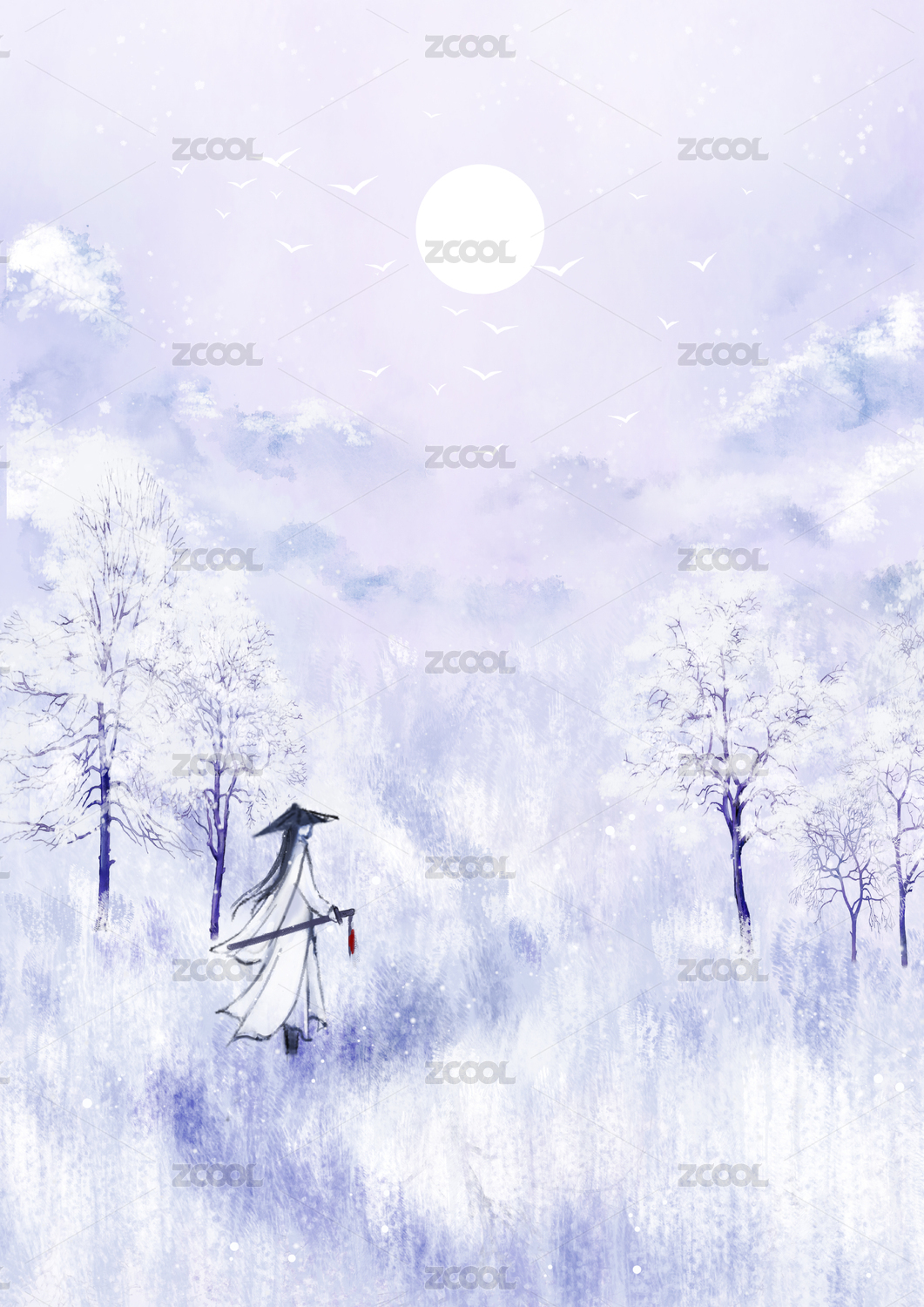 冬季下着雪古人打伞坐在石头上竹林小雪插画