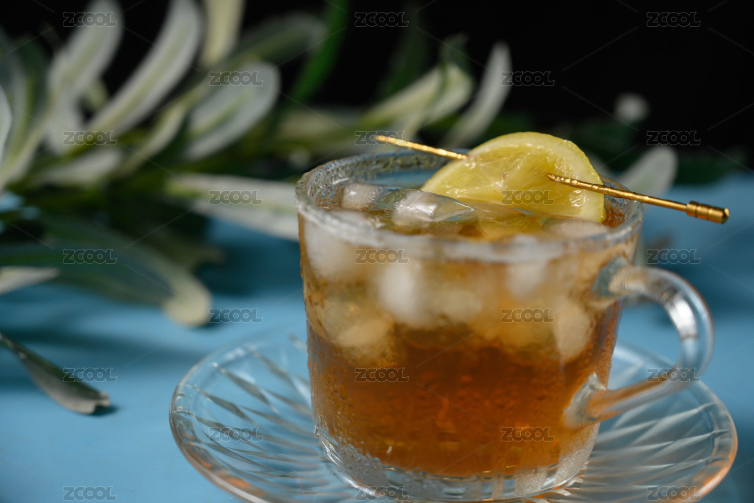 桌面上的杯子里的美味可口的冰蜜桃乌龙茶
