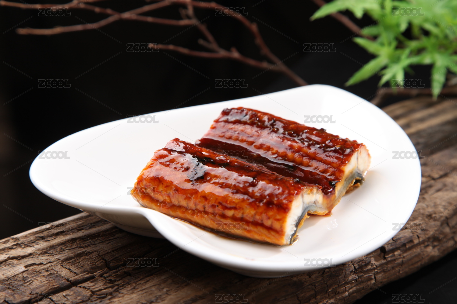 暗色木纹卓上放着一份烤鳗鱼日料米饭套餐