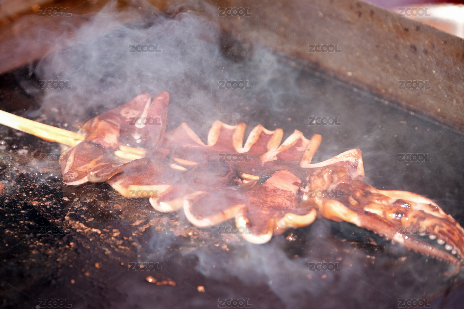 正在烤制的铁板鱿鱼铁板鱿鱼须特写