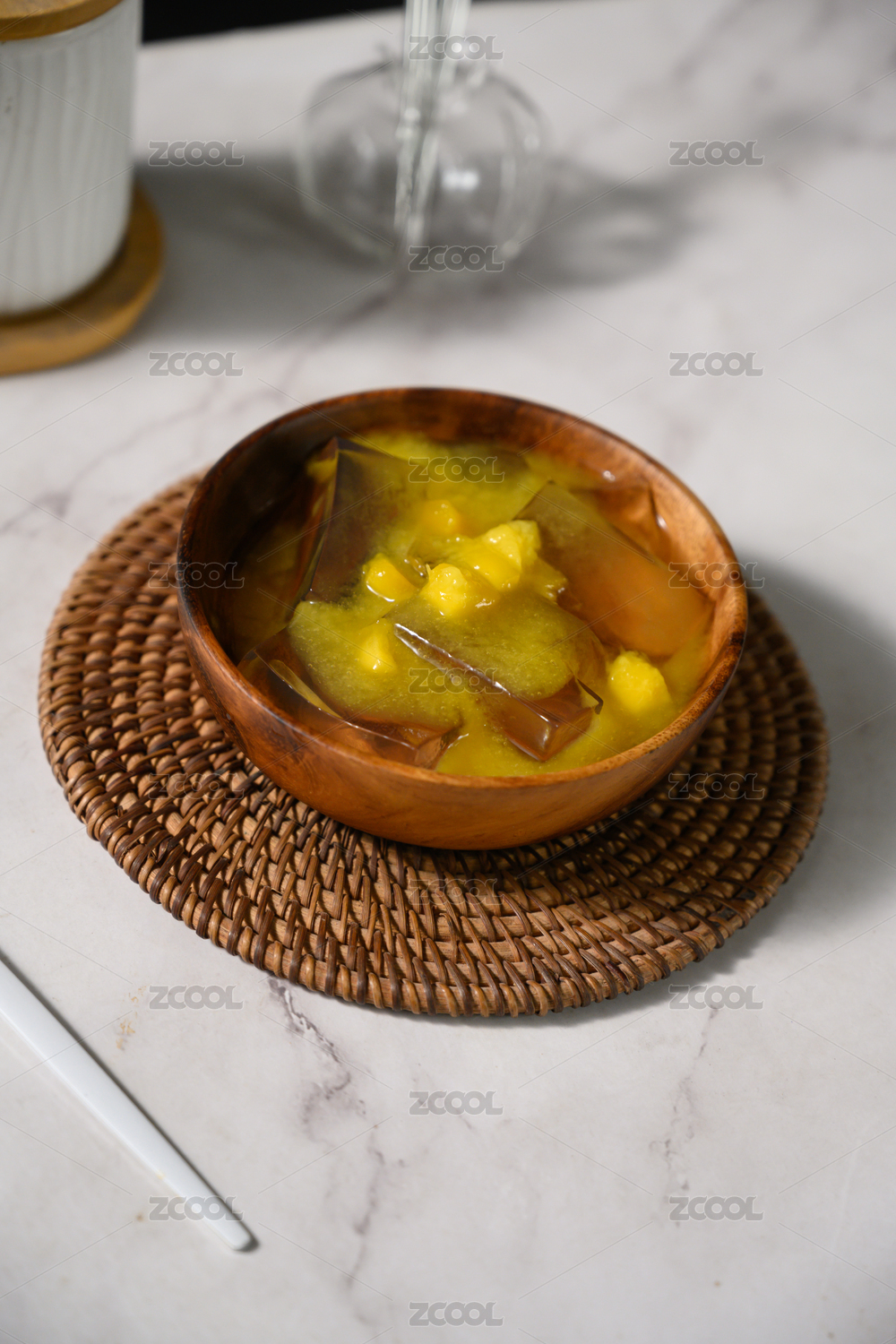 桌面上的碗里的美味可口的芒果凉粉