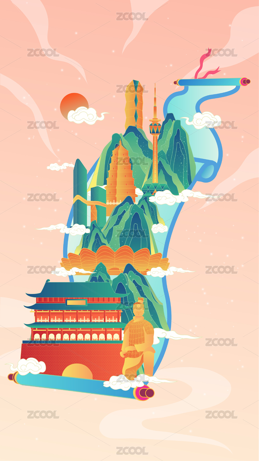 西安卷轴山水画中国风城市复古打卡地标旅游