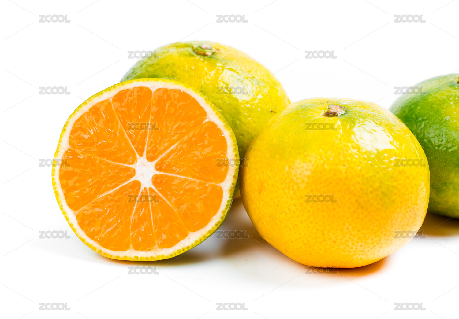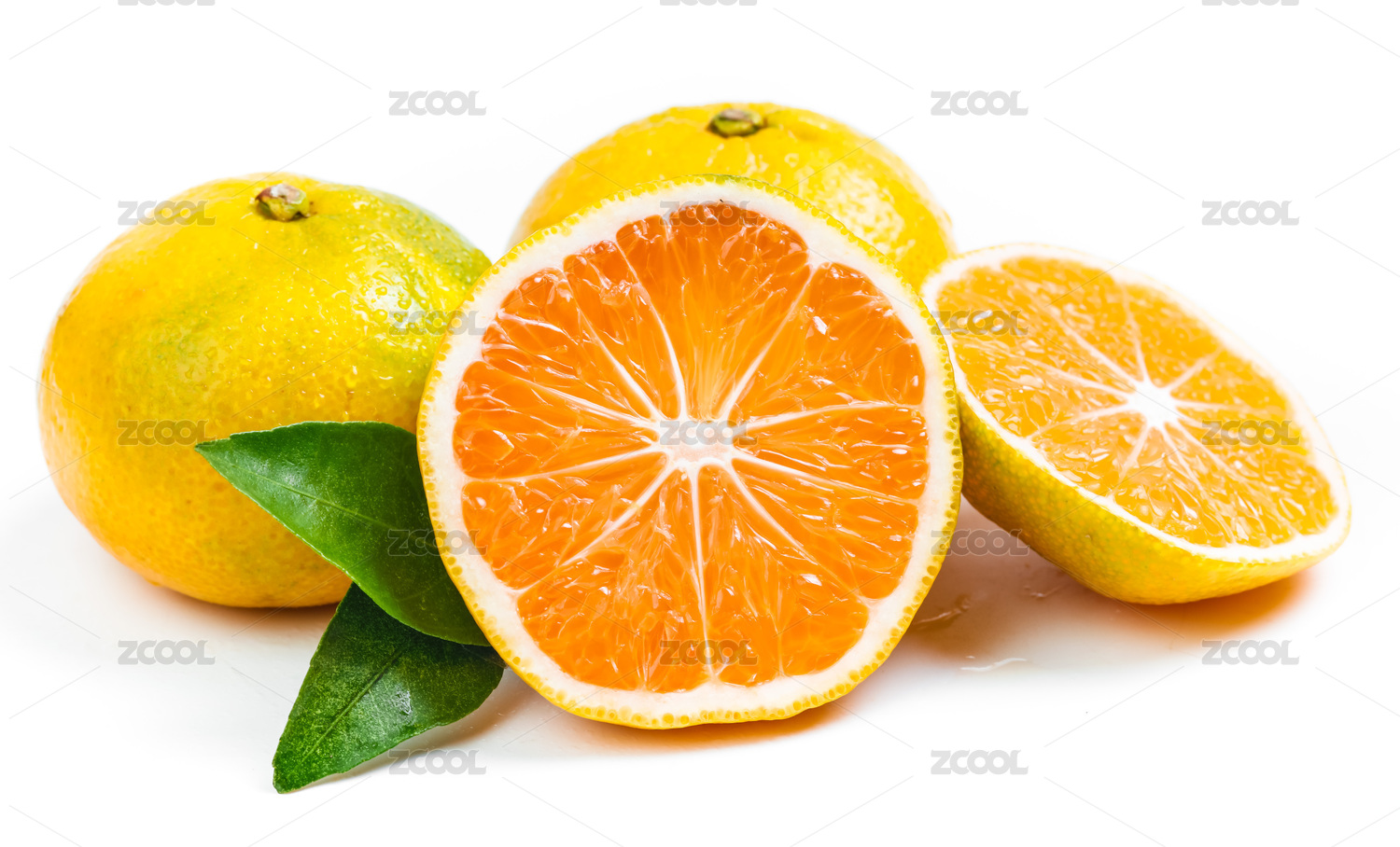 白底上两个完整的柑橘和一个切开的柑橘和一个柑橘果肉