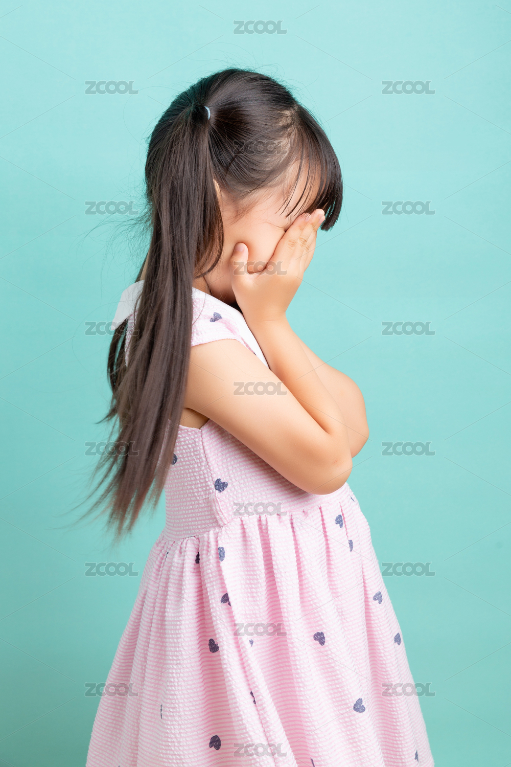 穿红毛衣的长发小女孩难过的低头捂着脸