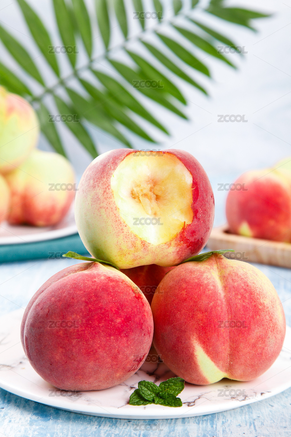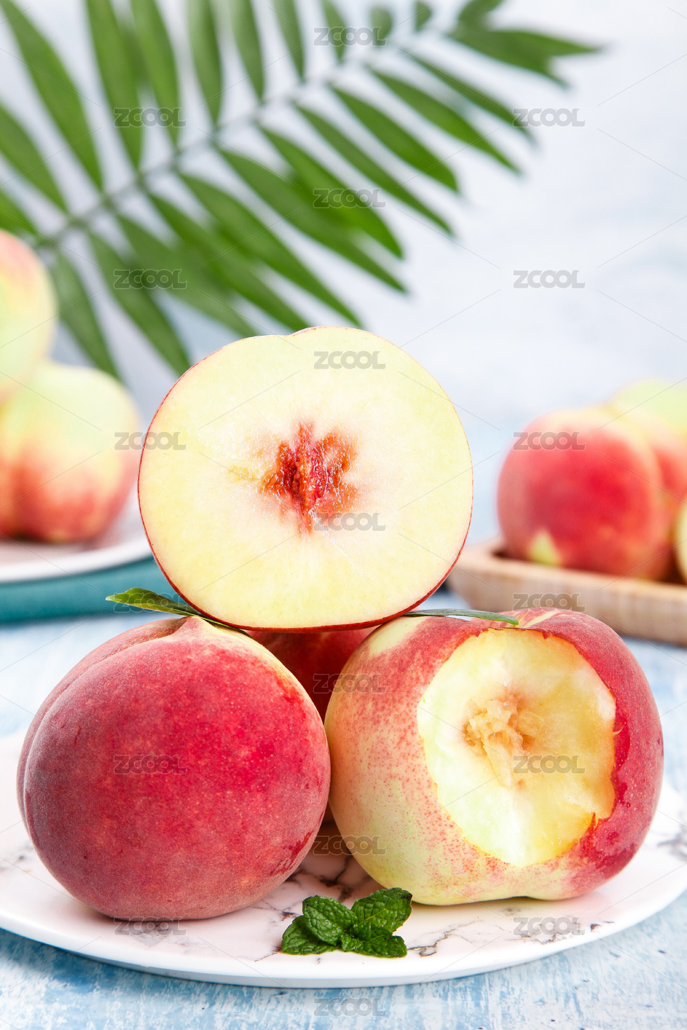 浅蓝底上放着一木盘映雪红桃和一个切面冬桃