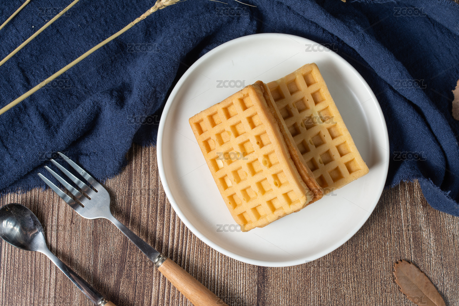 桌面上的白色陶瓷盘子里美味可口的华夫饼