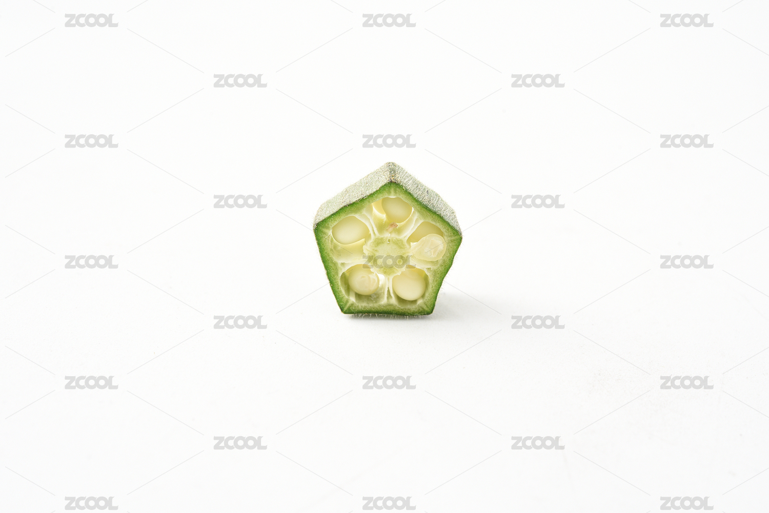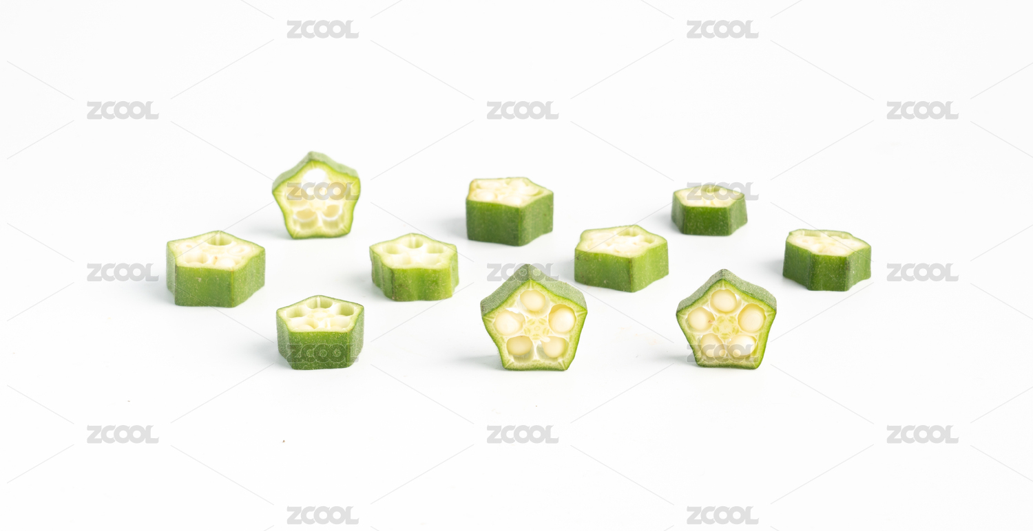 白色背景中的 新鲜嫩绿的秋葵切成片