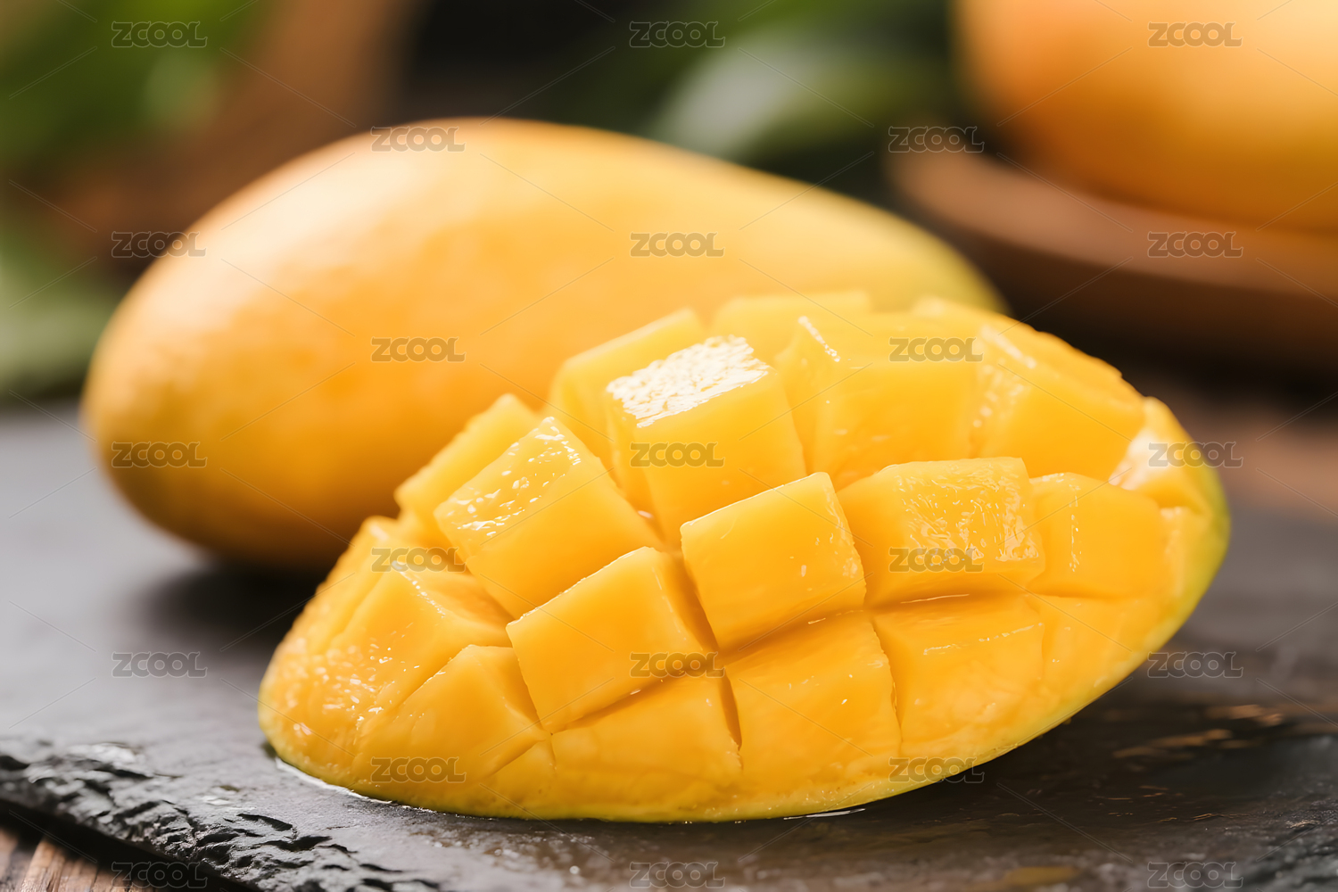 黑石板上放着半边缅甸进口鹰嘴芒果肉