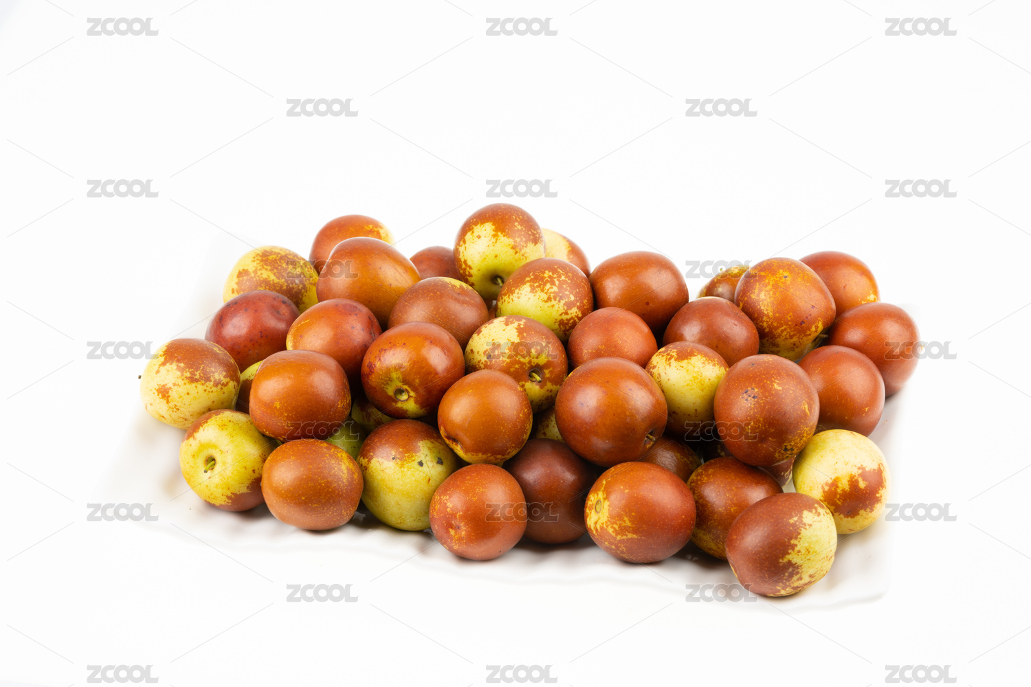 白色背景上的一盘新鲜青红色大枣
