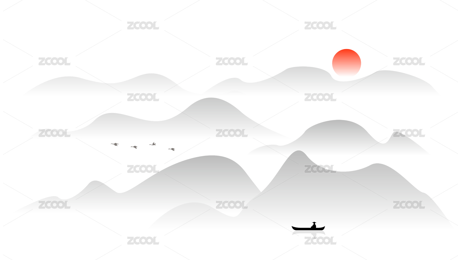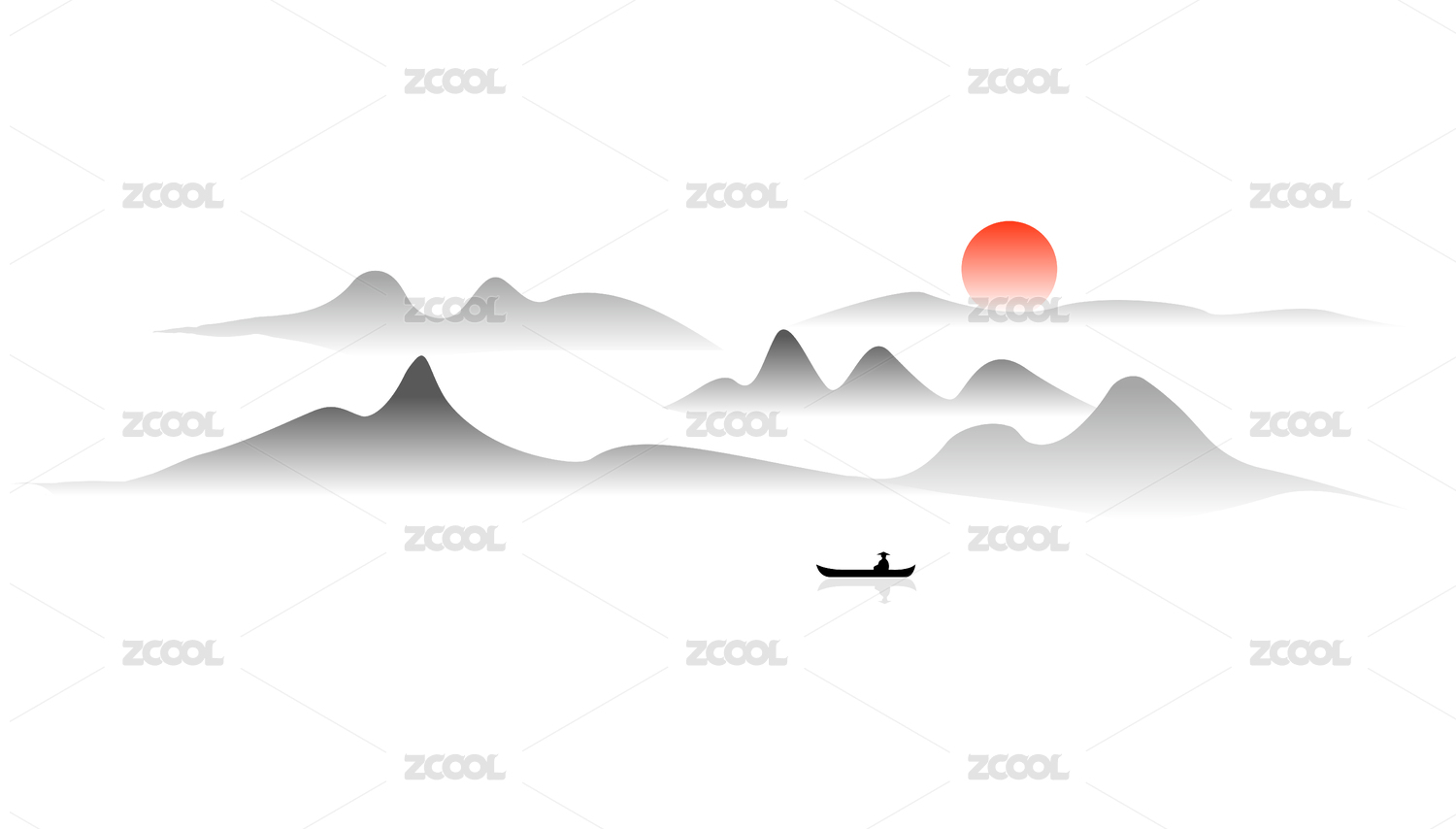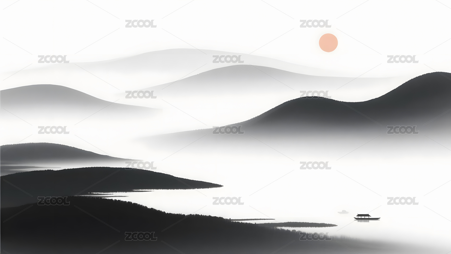 群山渔舟山水新中式水墨装饰矢量背景图