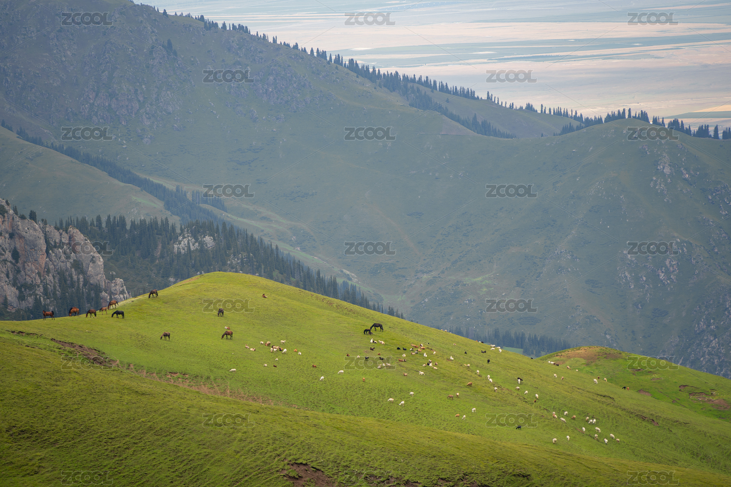 中国新疆伊犁那拉提草原高山草甸牧场牛羊