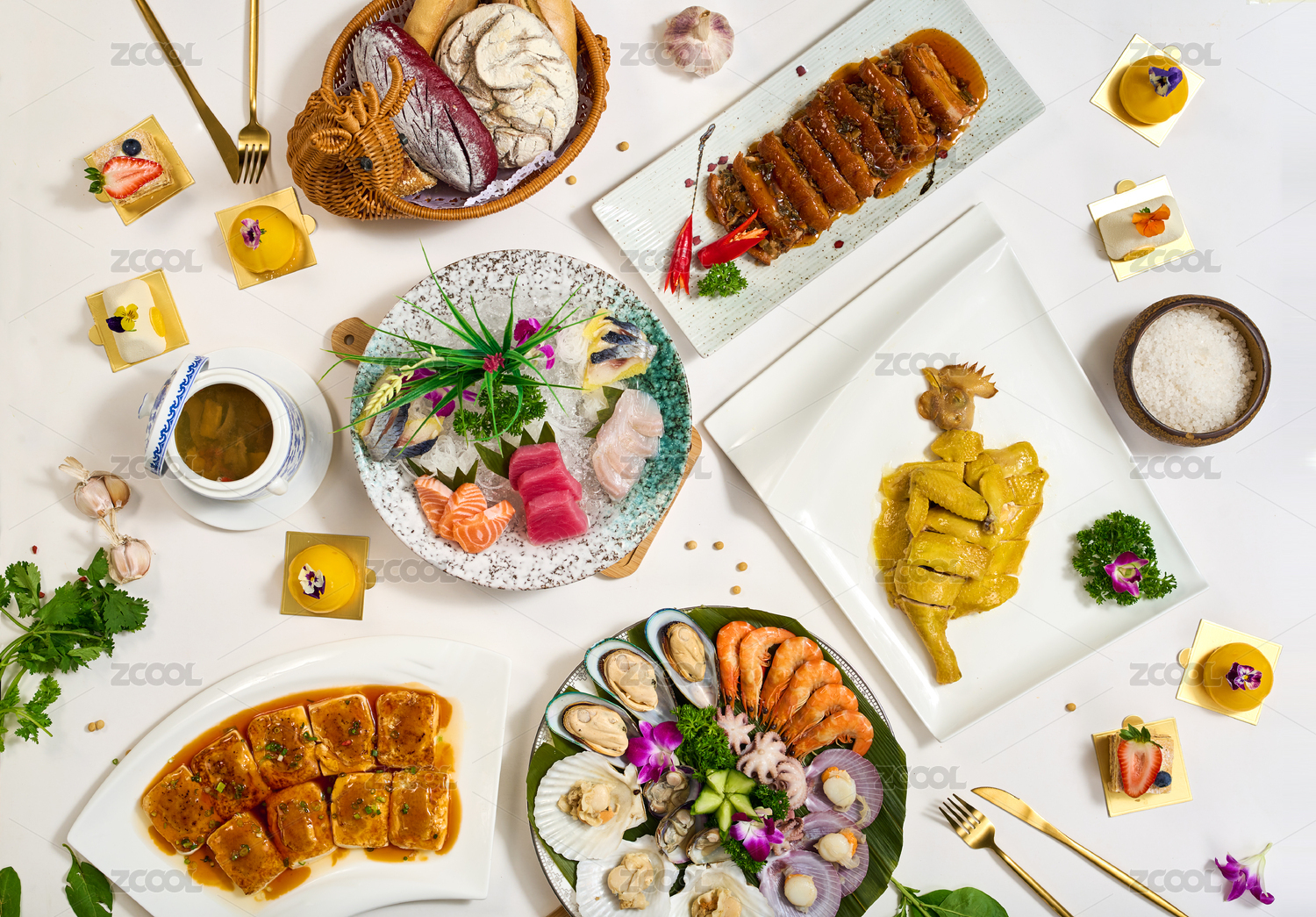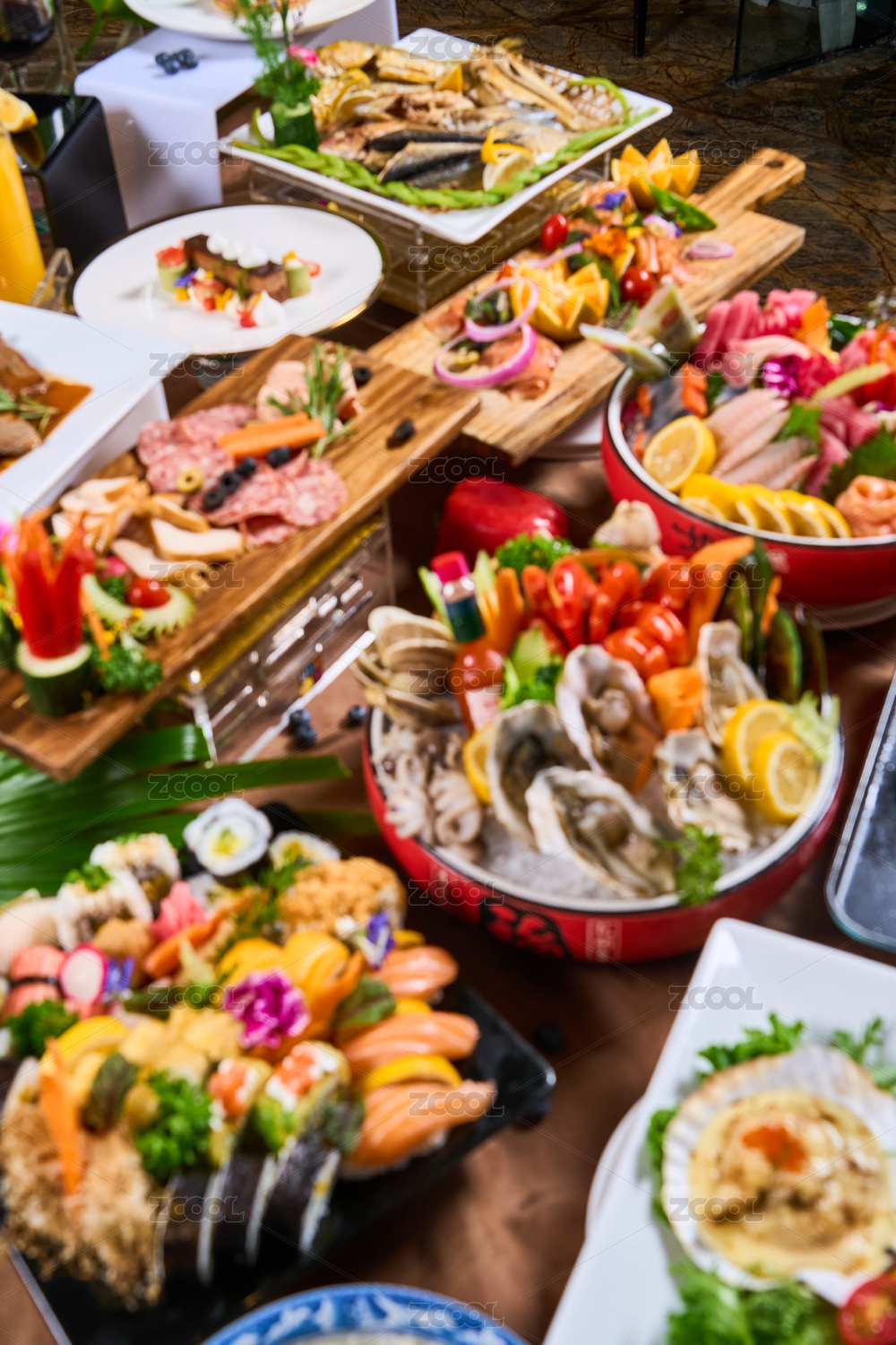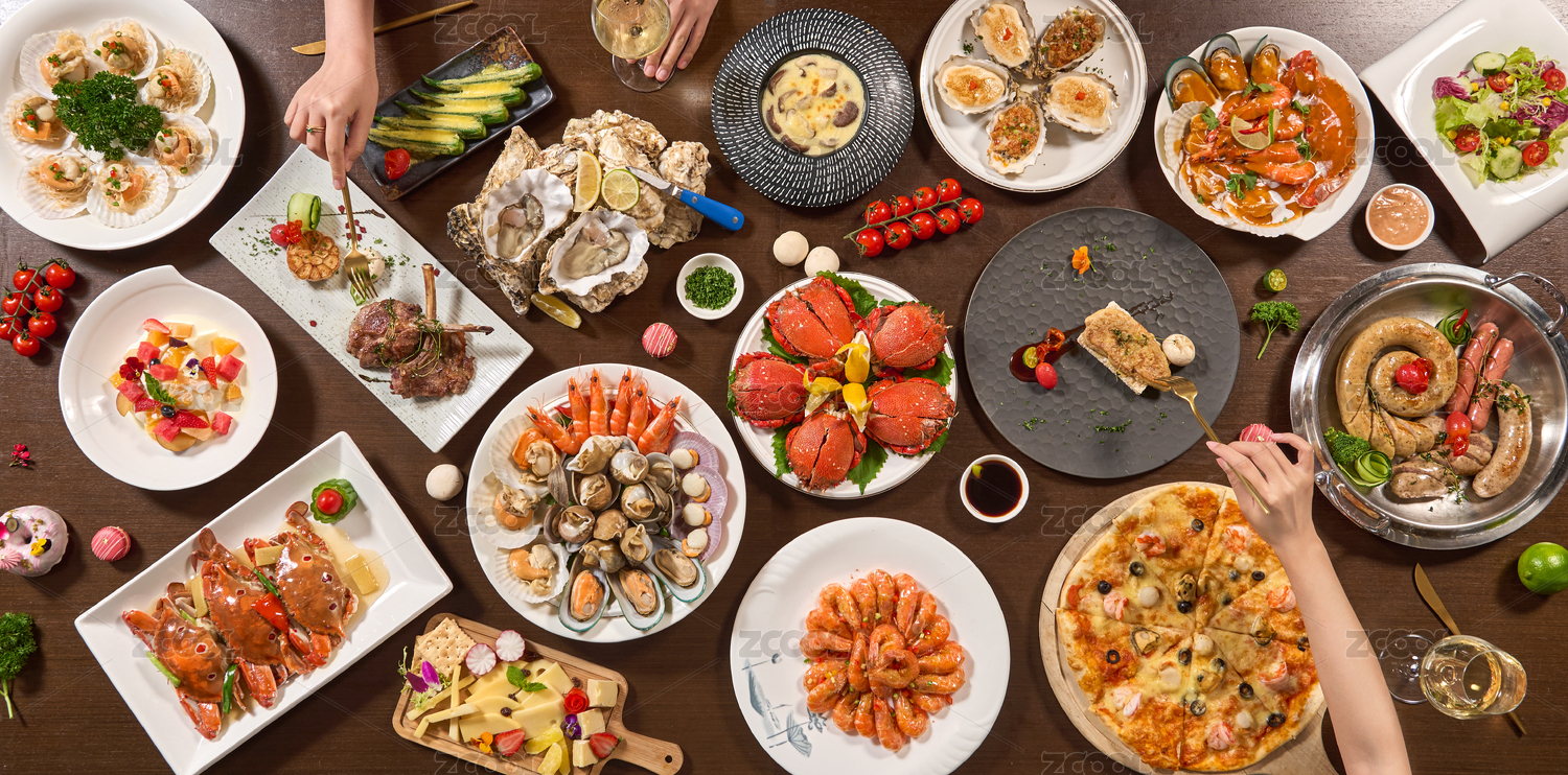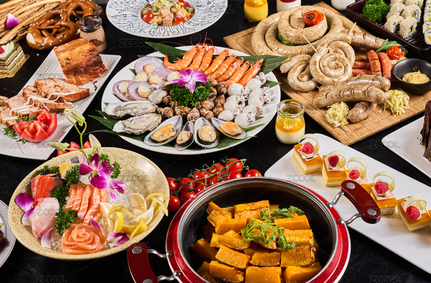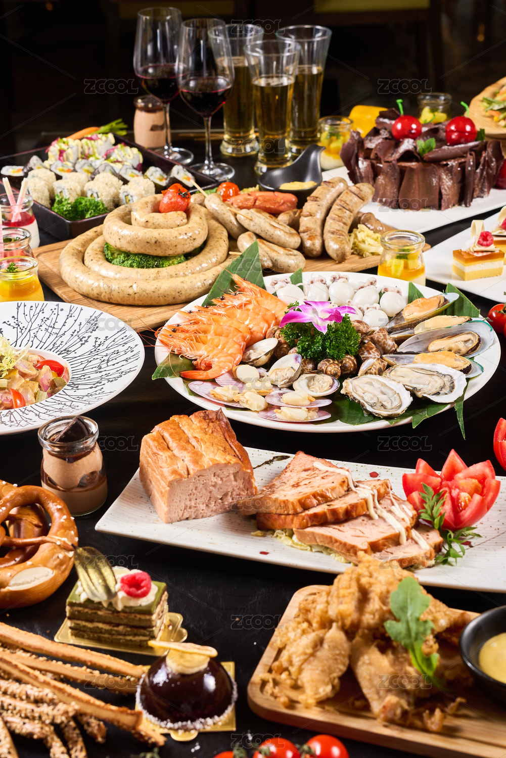 德国啤酒美食自助餐,黑色背景的,自助餐,烤香肠,海鲜大餐,德国啤酒,烤猪蹄,面包,丰盛的德国美食节大餐